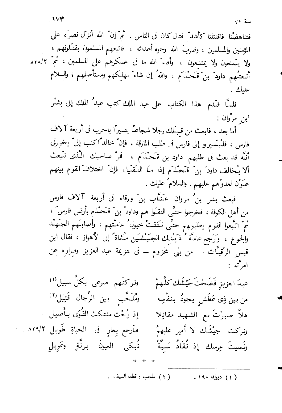 فبعث بشر بن مروان عتاب بن ورقاء في أربعة آلاف فارس من أهل الكوفة، فخرجوا حتى التقوا هم وداود بن قحذم بأرض فارس، ثم اتبعوا القوم يطلبونهم حتى نفقت خيول عامتهم، وأصابهم الجهد والجوع، ورجع عامة ذينك الجيشين مشاة إلى الأهواز، فقال ابن قيس الرقيات- من بني مخزوم- في هزيمة عبد العزيز وفراره عن امرأته: