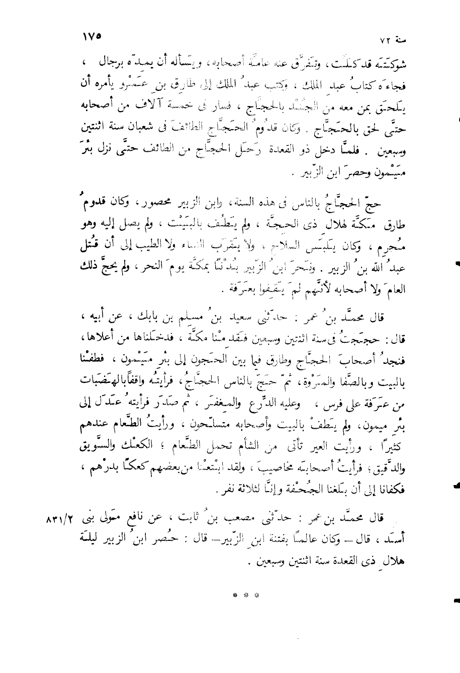 قال محمد بن عمر: حدثني سعيد بن مسلم بن بابك، عن أبيه، قال: حججت في سنة اثنتين وسبعين فقدمنا مكة، فدخلناها من أعلاها، فنجد أصحاب الحجاج وطارق فيما بين الحجون إلى بئر ميمون، فطفنا بالبيت وبالصفا والمروة، ثم حج بالناس الحجاج، فرأيته واقفا بالهضبات من عرفة على فرس، وعليه الدرع والمغفر، ثم صدر فرأيته عدل إلى بئر ميمون، ولم يطف بالبيت وأصحابه متسلحون، ورأيت الطعام عندهم كثيرا، ورأيت العير تأتي من الشام تحمل الطعام، الكعك والسويق والدقيق، فرأيت أصحابه مخاصيب، ولقد ابتعنا من بعضهم كعكا بدرهم، فكفانا إلى أن بلغنا الجحفة وإنا لثلاثة نفر.