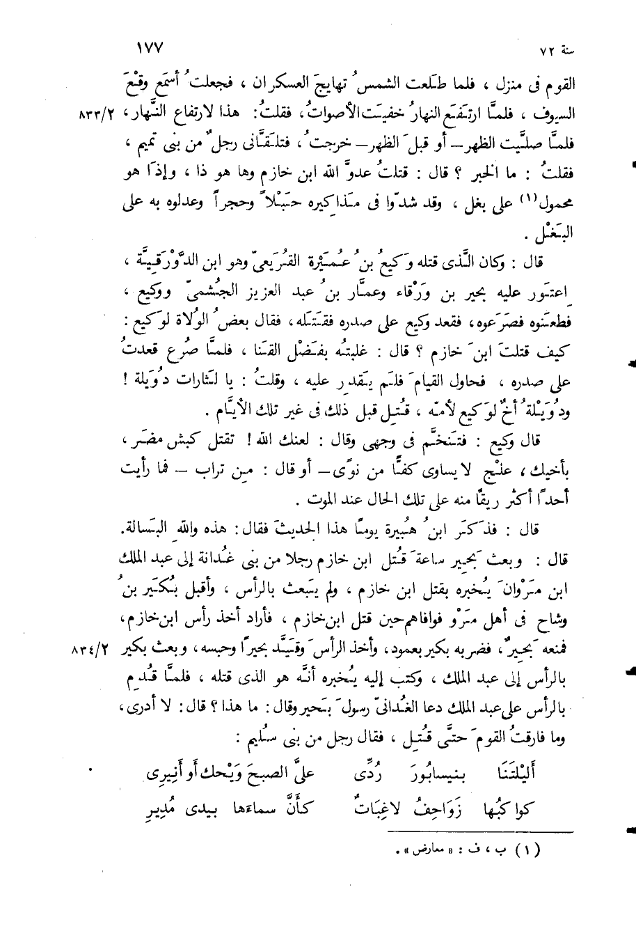 القوم في منزل، فلما طلعت الشمس تهايج العسكران، فجعلت أسمع وقع السيوف، فلما ارتفع النهار خفيت الأصوات، فقلت: هذا لارتفاع النهار، فلما صليت الظهر- أو قبل الظهر- خرجت، فتلقاني رجل من بني تميم، فقلت: ما الخبر؟ قال: قتلت عدو الله ابن خازم وها هو ذا، وإذا هو محمول على بغل، وقد شدوا في مذاكيره حبلا وحجرا وعدلوه به على البغل.