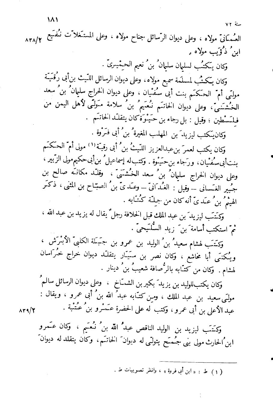 العماني مولاه، وعلى ديوان الرسائل جناح مولاه، وعلى المستغلات نفيع ابن ذؤيب مولاه.
