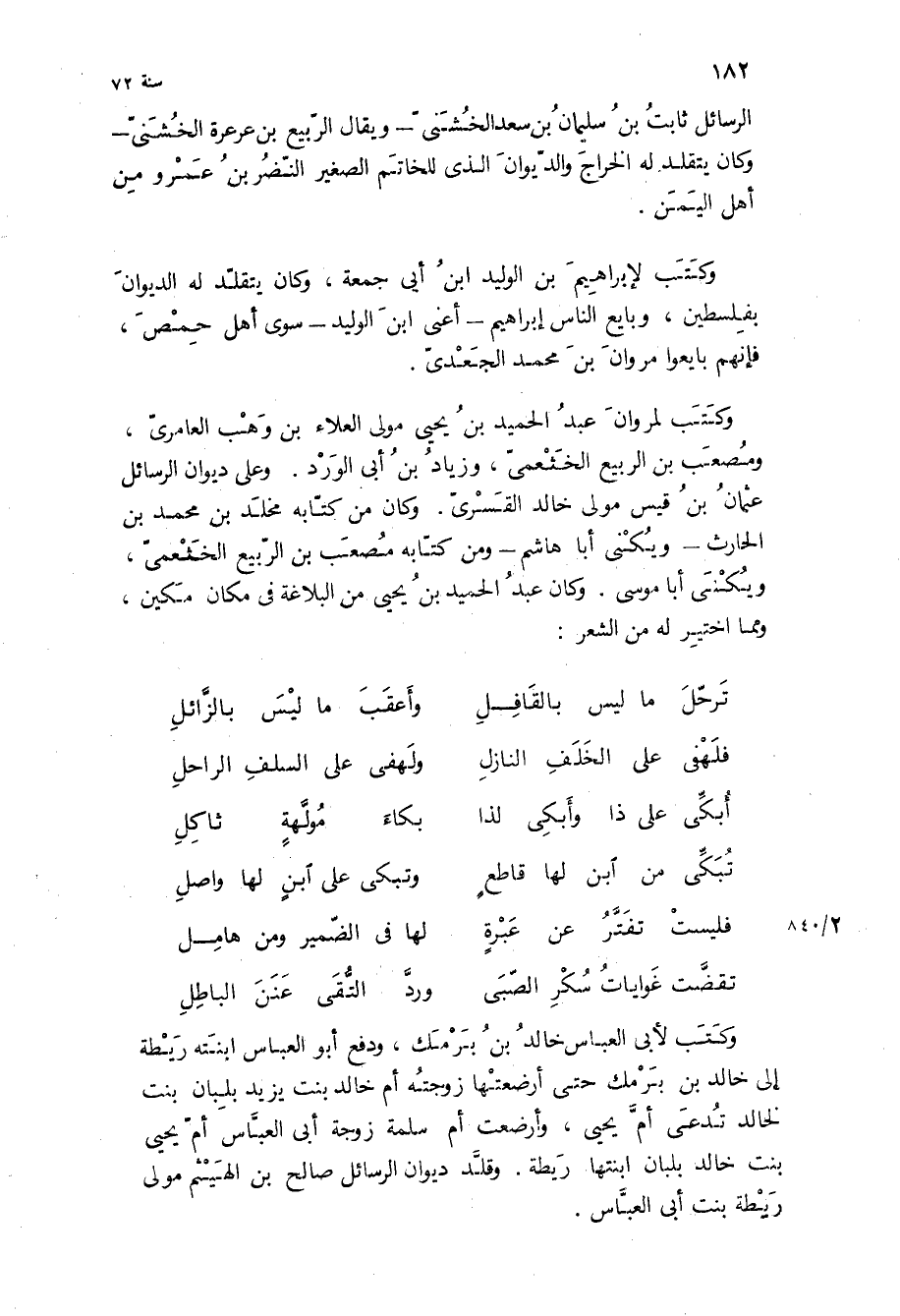 وكتب لإبراهيم بن الوليد ابن أبي جمعة، وكان يتقلد له الديوان بفلسطين، وبايع الناس إبراهيم- أعني ابن الوليد- سوى أهل حمص، فإنهم بايعوا مروان بن مُحَمَّد الجعدي وكتب لمروان عبد الحميد بن يحيى مولى العلاء بن وهب العامري، ومصعب بن الربيع الخثعمي، وزياد بن أبي الورد وعلى ديوان الرسائل عثمان بن قيس مولى خالد القسري وكان من كتابه مخلد بن مُحَمَّد بن الحارث- ويكنى أبا هاشم- ومن كتابه مصعب بن الربيع الخثعمي، ويكنى أبا موسى وكان عبد الحميد بن يحيى من البلاغة في مكان مكين، ومما اختير له من الشعر: