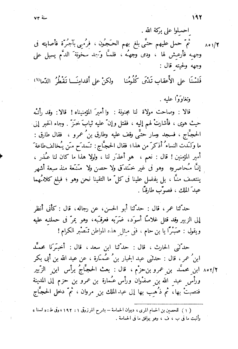 حدثنا عمر، قال: حدثنا أبو الحسن، عن رجاله، قال: كأني أنظر إلى الزبير وقد قتل غلاما أسود، ضربه فعرقبه، وهو يمر في حملته عليه ويقول: صبرا يا بن حام، ففي مثل هذه المواطن تصبر الكرام! حدثني الحارث، قال: حدثنا ابن سعد، قال: أخبرنا محمد ابن عمر، قال: حدثني عبد الجبار بن عمارة، عن عبد الله بن ابى بكر ابن مُحَمَّد بن عمرو بن حزم، قال: بعث الحجاج برأس ابن الزبير ورأس عبد الله بن صفوان ورأس عمارة بن عمرو بن حزم إلى المدينة فنصبت بها، ثم ذهب بها إلى عبد الملك بن مروان، ثم دخل الحجاج
