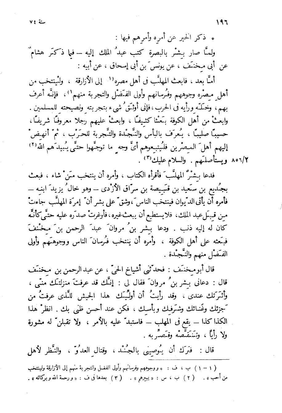 أما بعد، فابعث المهلب في أهل مصره إلى الأزارقة، ولينتخب من أهل مصره وجوههم وفرسانهم وأولي الفضل والتجربة منهم، فإنه أعرف بهم، وخله ورأيه في الحرب، فإني أوثق شيء بتجربته ونصيحته للمسلمين، وابعث من أهل الكوفة بعثا كثيفا، وابعث عليهم رجلا معروفا شريفا، حسيبا صليبا، يعرف بالبأس والنجدة والتجربة للحرب، ثم أنهض إليهم أهل المصرين فليتبعوهم أي وجه ما توجهوا حتى يبيدهم الله ويستأصلهم والسلام عليك.