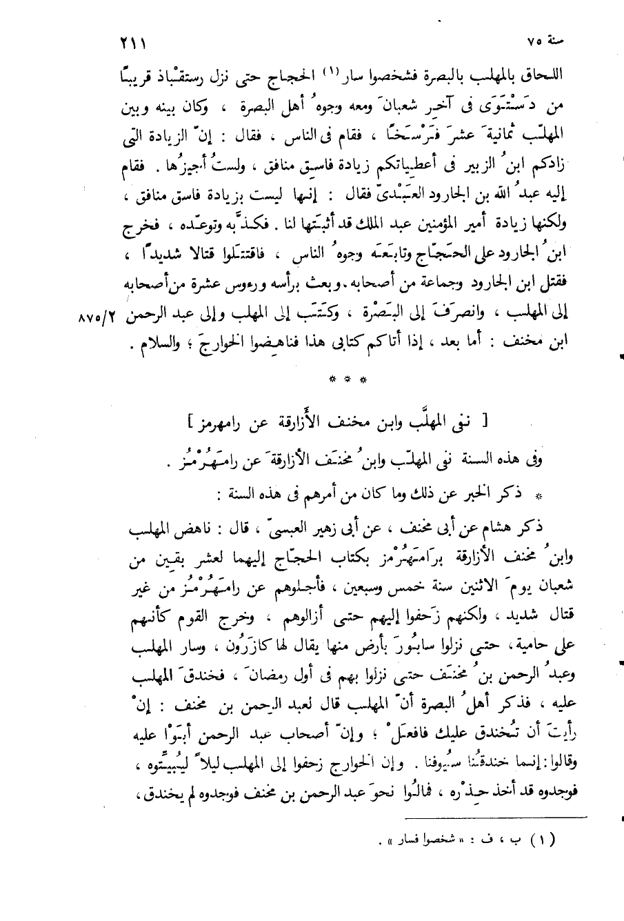 ذكر الخبر عن ذَلِكَ وما كَانَ من أمرهم في هذه السنة: ذكر هشام عن أبي مخنف، عن أبي زهير العبسي، قال: ناهض المهلب وابن مخنف الأزارقة برامهرمز بكتاب الحجاج إليهما لعشر بقين من شعبان يوم الاثنين سنة خمس وسبعين، فأجلوهم عن رامهرمز من غير قتال شديد، ولكنهم زحفوا اليهم حتى أزالوهم، وخرج القوم كأنهم على حامية، حتى نزلوا سابور بأرض منها يقال لها كازرون، وسار المهلب وعبد الرحمن بن مخنف حتى نزلوا بهم في أول رمضان، فخندق المهلب عليه، فذكر أهل البصرة أن المهلب قال لعبد الرحمن بن مخنف: إن رأيت أن تخندق عليك فافعل، وإن أصحاب عبد الرحمن أبوا عليه وقالوا: إنما خندقنا سيوفنا وإن الخوارج زحفوا إلى المهلب ليلا ليبيتوه، فوجدوه قد أخذ حذره، فمالوا نحو عبد الرحمن بن مخنف فوجدوه لم يخندق،