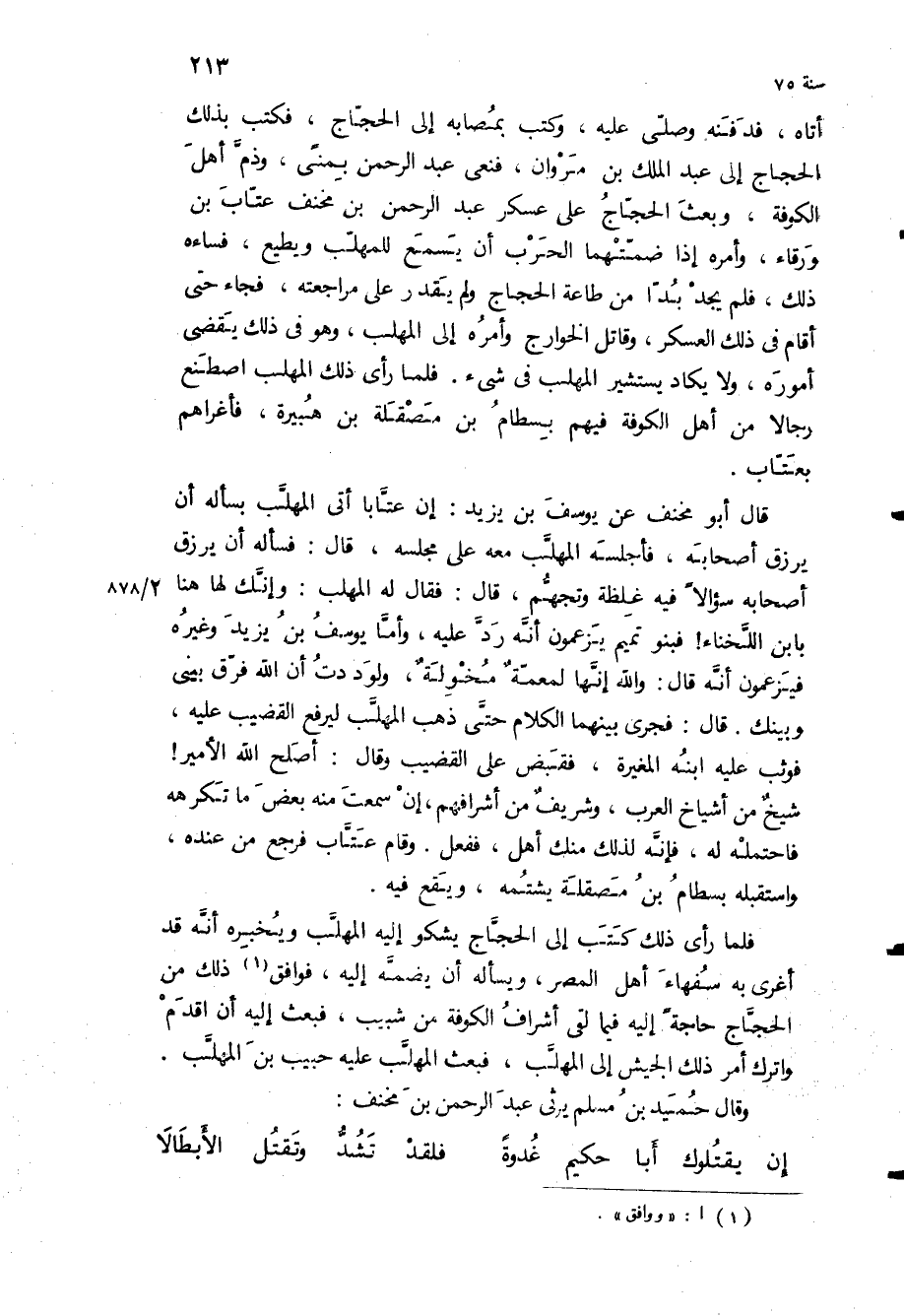 فلما رأى ذلك كتب إلى الحجاج يشكو إليه المهلب ويخبره أنه قد أغرى به سفهاء أهل المصر، ويسأله أن يضمه إليه، فوافق ذلك من الحجاج حاجة إليه فيما لقي أشراف الكوفة من شبيب، فبعث إليه أن أقدم واترك أمر ذلك الجيش إلى المهلب، فبعث المهلب عليه حبيب بن المهلب.