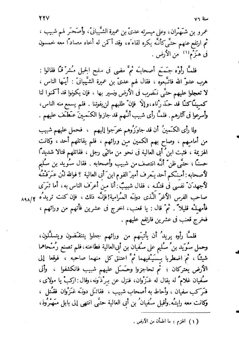 فلما رأوه يريد أن يأتيهم من ورائهم جعلوا يتنقضون ويتسللون، وحمل سويد بن سليم على سفيان بن أبي العالية فطاعنه، فلم تصنع رمحاهما شيئا، ثم اضطربا بسيفيهما ثم اعتنق كل منهما صاحبه، فوقعا الى الارض يعتركان، ثم تحاجزوا وحمل عليهم شبيب فانكشفوا، وأتى سفيان غلام له يقال له غزوان، فنزل عن برذونه، وقال: اركب يا مولاي، فركب سفيان، وأحاط به أصحاب شبيب، فقاتل دونه غزوان فقتل، وكانت معه رايته وأقبل سفيان بن أبي العاليه حتى انتهى الى بابل مهروذ،