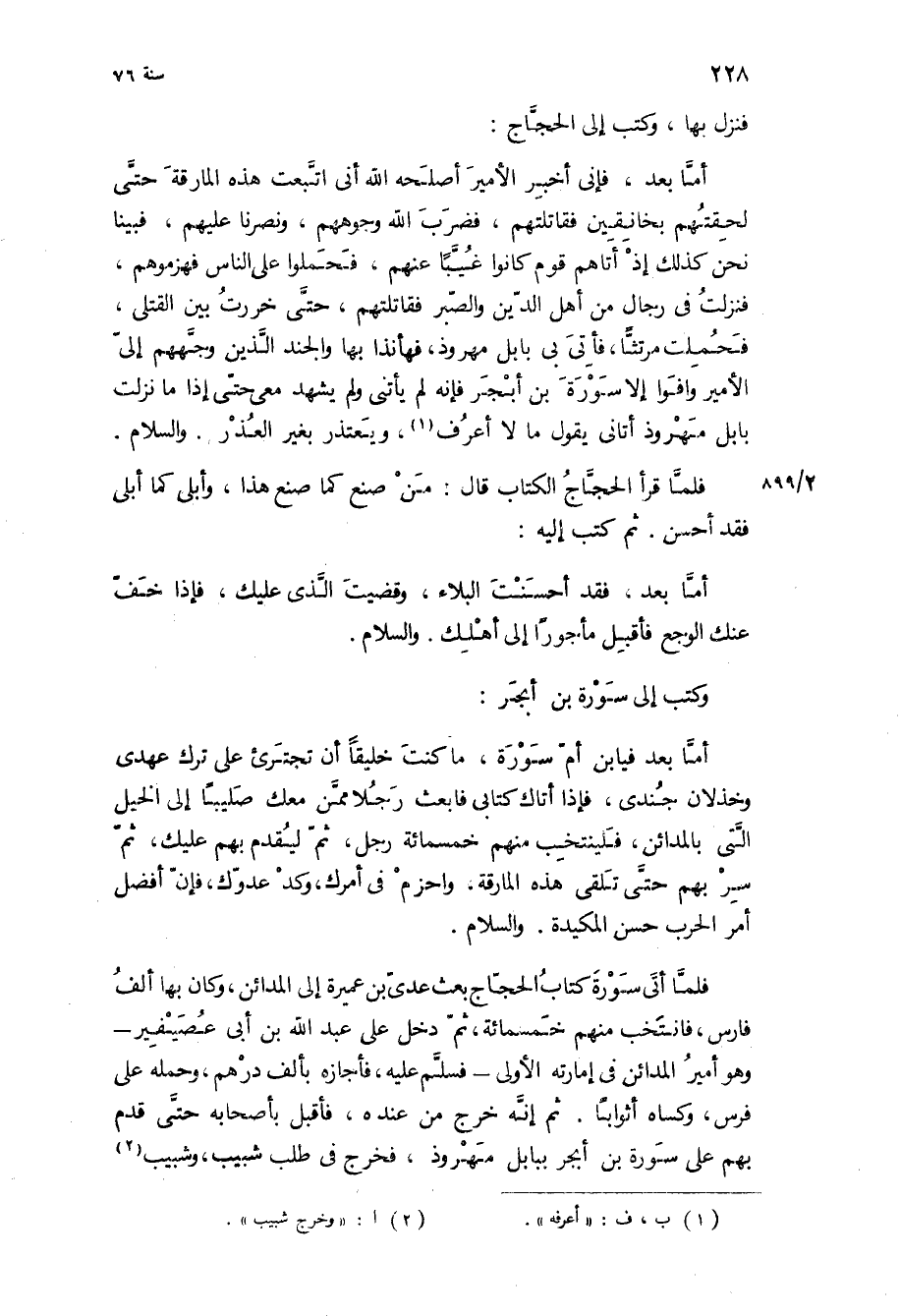 أما بعد، فإني أخبر الأمير أصلحه الله أني اتبعت هذه المارقة حتى لحقتهم بخانقين فقاتلتهم، فضرب الله وجوههم، ونصرنا عليهم، فبينا نحن كذلك إذ أتاهم قوم كانوا غيبا عنهم، فحملوا على الناس فهزموهم، فنزلت في رجال من أهل الدين والصبر فقاتلتهم، حتى خررت بين القتلى، فحملت مرتثا، فاتى بي بابل مهروذ، فها انا بها والجند الذين وجههم إلي الأمير وافوا إلا سورة بن أبجر فإنه لم يأتني ولم يشهد معي حتى إذا ما نزلت بابل مهروذ أتاني يقول ما لا أعرف، ويعتذر بغير العذر والسلام فلما قرأ الحجاج الكتاب قال: من صنع كما صنع هذا، وأبلى كما أبلى فقد أحسن ثم كتب إليه: