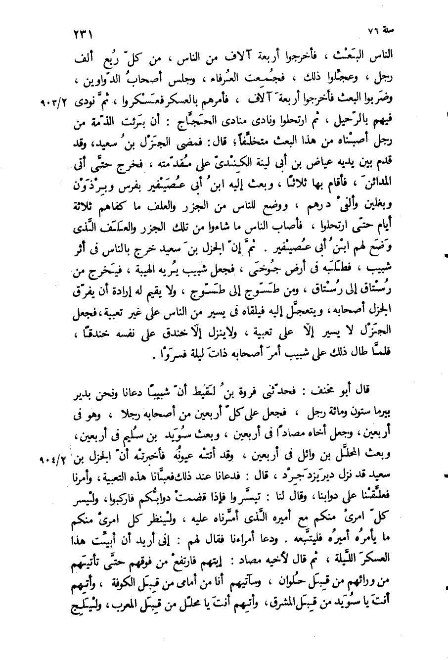 الناس البعث، فأخرجوا أربعة آلاف من الناس، من كل ربع الف رجل، وعجلوا ذلك، فجمعت العرفاء، وجلس أصحاب الدواوين، وضربوا البعث فأخرجوا أربعة آلاف فأمرهم بالعسكر فعسكروا، ثم نودي فيهم بالرحيل، ثم ارتحلوا ونادى منادي الحجاج: أن برئت الذمة من رجل أصبناه من هذا البعث متخلفا، قال: فمضى الجزل بن سعيد، وقد قدم بين يديه عياض بن أبي لينة الكندي على مقدمته، فخرج حتى أتى المدائن، فأقام بها ثلاثا، وبعث إليه ابن أبي عصيفير بفرس وبرذون وبغلين وألفي درهم، ووضع للناس من الجزر والعلف ما كفاهم ثلاثة أيام حتى ارتحلوا، فأصاب الناس ما شاءوا من تلك الجزر والعلف الذي وضع لهم ابن أبي عصيفير ثم إن الجزل بن سعيد خرج بالناس في أثر شبيب، فطلبه في أرض جوخى، فجعل شبيب يريه الهيبة، فيخرج من رستاق إلى رستاق، ومن طسوج إلى طسوج، ولا يقيم له إرادة أن يفرق الجزل أصحابه، ويتعجل إليه فيلقاه في يسير من الناس على غير تعبئة فعجل الجزل لا يسير الا على تعبئة، ولا ينزل إلا خندق على نفسه خندقا، فلما طال ذلك على شبيب أمر أصحابه ذات ليلة فسروا.
