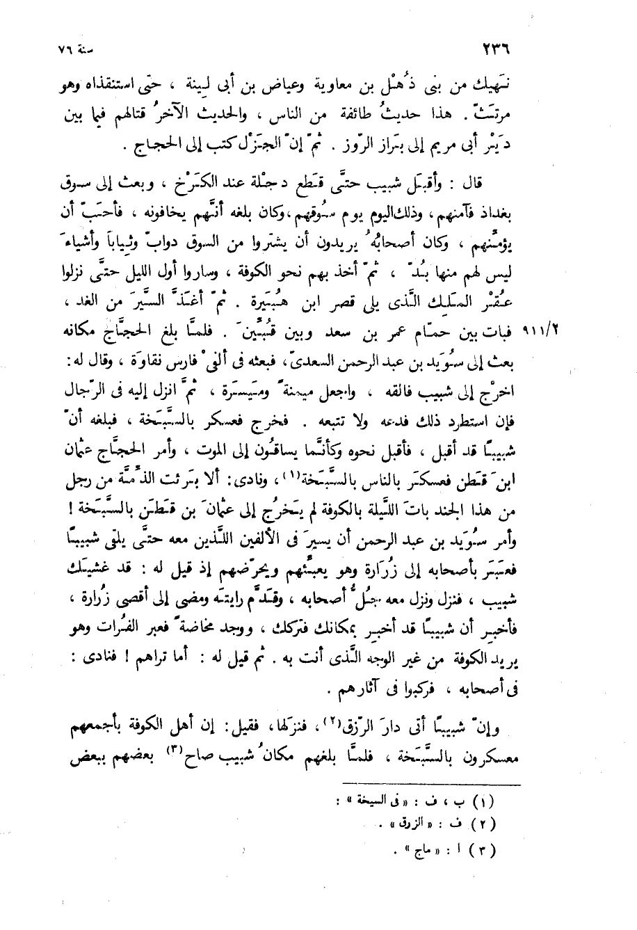 اخرج إلى شبيب فالقه، واجعل ميمنة وميسرة، ثم انزل إليه في الرجال فإن استطرد ذلك فدعه ولا تتبعه فخرج فعسكر بالسبخة، فبلغه أن شبيبا قد أقبل، فأقبل نحوه وكأنما يساقون الى الموت، وامر الحجاج عثمان ابن قطن فعسكر بالناس بالسبخة، ونادى: ألا برئت الذمة من رجل من هذا الجند بات الليلة بالكوفة لم يخرج إلى عثمان بن قطن بالسبخة! وأمر سويد بن عبد الرحمن أن يسير في الألفين اللذين معه حتى يلقى شبيبا فعبر بأصحابه إلى زرارة وهو يعبئهم ويحرضهم إذ قيل له: قد غشيك شبيب، فنزل ونزل معه جل أصحابه، وقدم رايته ومضى إلى أقصى زرارة، فأخبر أن شبيبا قد أخبر بمكانك فتركك، ووجد مخاضة فعبر الفرات وهو يريد الكوفة من غير الوجه الذي أنت به ثم قيل له: أما تراهم! فنادى: