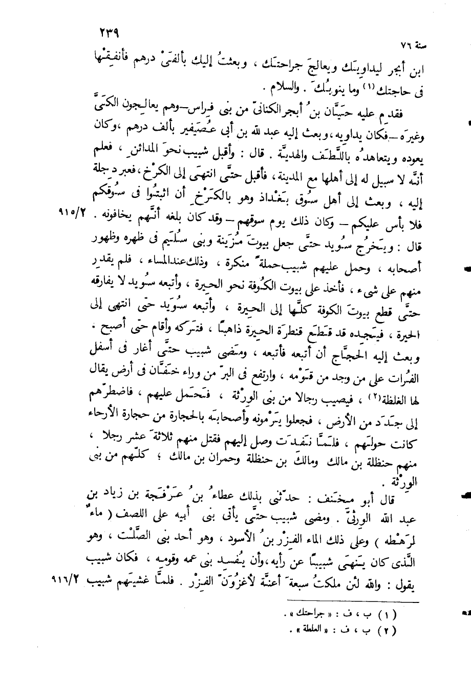 فقدم عليه حيان بن أبجر الكناني من بني فراس- وهم يعالجون الكي وغيره- فكان يداويه، وبعث إليه عبد الله بن أبي عصيفير بألف درهم، وكان يعوده ويتعاهده باللطف والهدية قال: وأقبل شبيب نحو المدائن، فعلم أنه لا سبيل له إلى أهلها مع المدينة، فأقبل حتى انتهى إلى الكرخ، فعبر دجلة إليه، وبعث إلى أهل سوق بغداد وهو بالكرخ أن اثبتوا في سوقكم فلا بأس عليكم- وكان ذلك يوم سوقهم- وقد كان بلغه أنهم يخافونه قال: ويخرج سويد حتى جعل بيوت مزينة وبني سليم في ظهره وظهور أصحابه، وحمل عليهم شبيب حملة منكرة، وذلك عند المساء، فلم يقدر منهم على شيء، فأخذ على بيوت الكوفة نحو الحيرة، وأتبعه سويد لا يفارقه حتى قطع بيوت الكوفة كلها إلى الحيرة، وأتبعه سويد حتى انتهى إلى الحيرة، فيجده قد قطع قنطرة الحيرة ذاهبا، فتركه وأقام حتى أصبح، وبعث إليه الحجاج أن أتبعه فأتبعه، ومضى شبيب حتى أغار في أسفل الفرات على من وجد من قومه، وارتفع في البر من وراء خفان في أرض يقال لها الغلظة، فيصيب رجالا من بني الورثة، فحمل عليهم، فاضطرهم إلى جدد من الأرض، فجعلوا يرمونه واصحابه بالحجارة من حجارة الأرحاء كانت حولههم، فلما نفدت وصل إليهم فقتل منهم ثلاثة عشر رجلا، منهم حنظلة بن مالك ومالك بن حنظلة وحمران بن مالك، كلهم من بني الورثة.