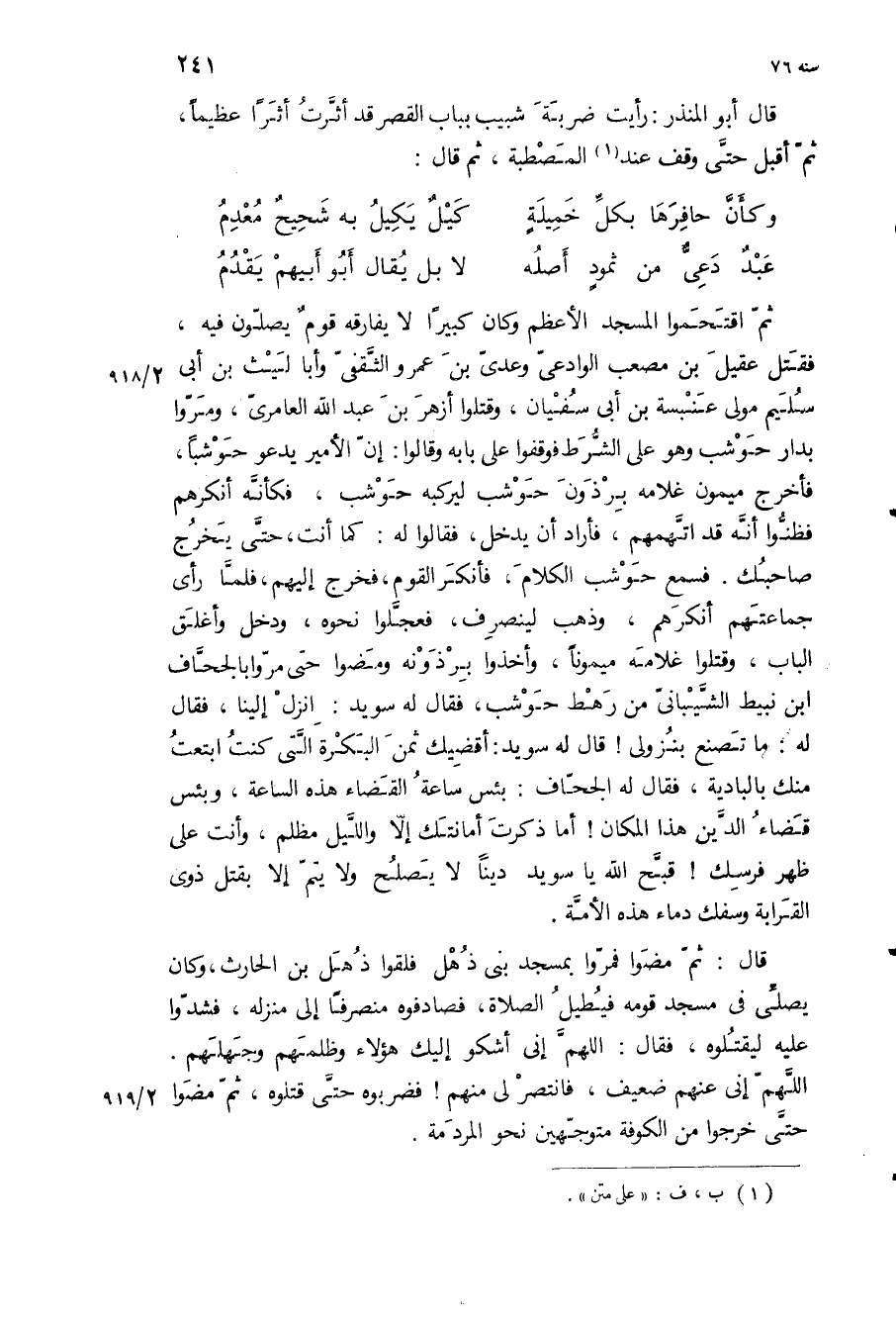 قال أبو المنذر: رأيت ضربة شبيب بباب القصر قد أثرت أثرا عظيما، ثم أقبل حتى وقف عند المصطبة، ثم قال: