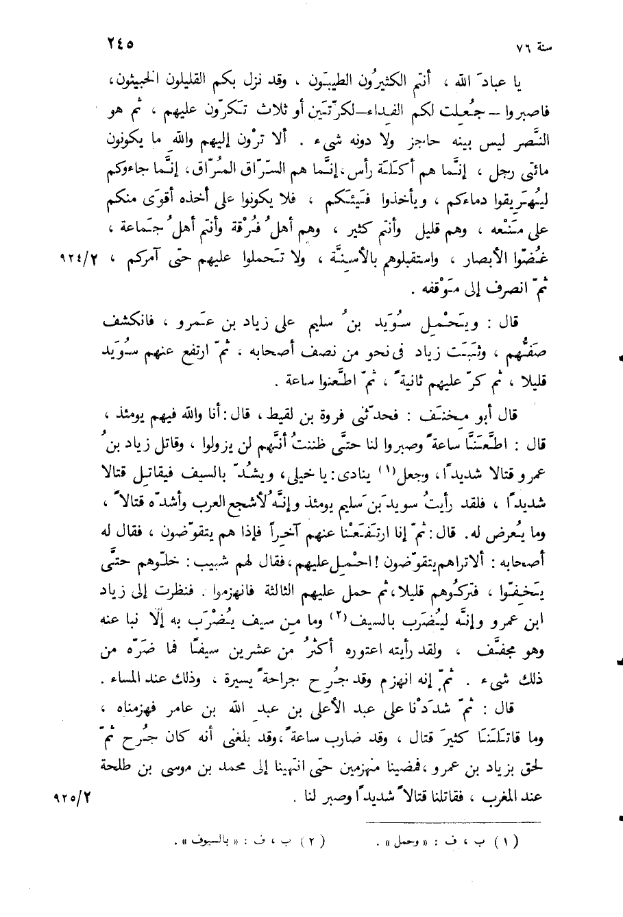 قال: ويحمل سويد بن سليم على زياد بن عمرو، فانكشف صفهم، وثبت زياد في نحو من نصف أصحابه، ثم ارتفع عنهم سويد قليلا، ثم كر عليهم ثانية، ثم اطعنوا ساعة.