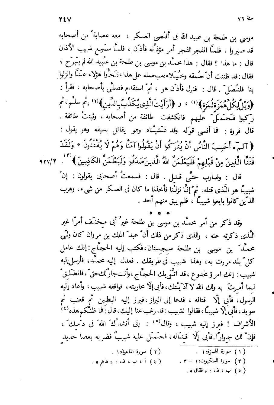«الم أَحَسِبَ النَّاسُ أَنْ يُتْرَكُوا أَنْ يَقُولُوا آمَنَّا وَهُمْ لا يُفْتَنُونَ وَلَقَدْ فَتَنَّا الَّذِينَ مِنْ قَبْلِهِمْ فَلَيَعْلَمَنَّ اللَّهُ الَّذِينَ صَدَقُوا وَلَيَعْلَمَنَّ الْكاذِبِينَ» قال: وضارب حتى قتل قال: فسمعت أصحابي يقولون: إن شبيبا هو الذي قتله ثم إنا نزلنا فأخذنا ما كان في العسكر من شيء، وهرب الذين كانوا بايعوا شبيبا، فلم يبق منهم أحد.