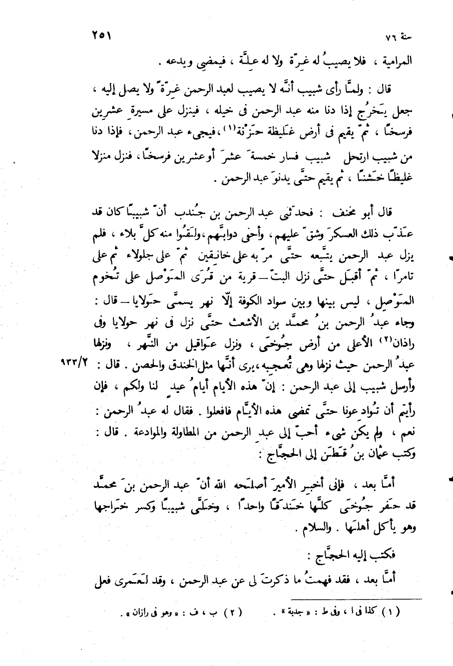 قال أبو مخنف: فحدثني عبد الرحمن بن جندب أن شبيبا كان قد عذب ذلك العسكر وشق عليهم، وأحفى دوابهم، ولقوا منه كل بلاء، فلم يزل عبد الرحمن يتبعه حتى مر به على خانقين ثم على جلولاء ثم على تامرا، ثم أقبل حتى نزل البت- قرية من قرى الموصل على تخوم الموصل، ليس بينها وبين سواد الكوفة إلا نهر يسمى حولايا- قال: