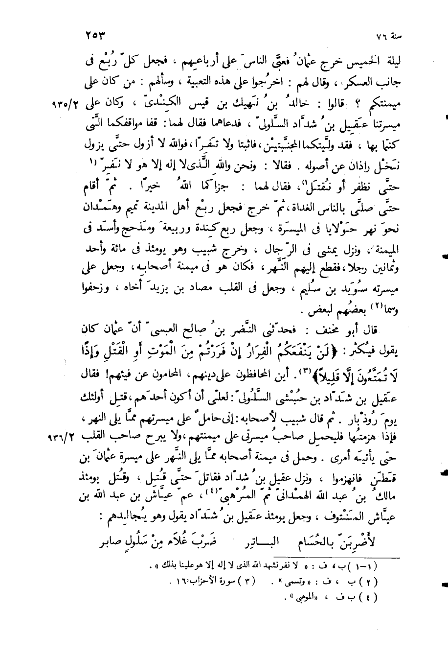قَالَ أَبُو مخنف: فَحَدَّثَنِي النضر بن صالح العبسي أن عثمان كان يقول فيكثر: «لَنْ يَنْفَعَكُمُ الْفِرارُ إِنْ فَرَرْتُمْ مِنَ الْمَوْتِ أَوِ الْقَتْلِ وَإِذاً لا تُمَتَّعُونَ إِلَّا قَلِيلًا» أين المحافظون على دينهم، المحامون عن فيئهم! فقال عقيل بن شداد بن حبشي السلولي: لعلي أن أكون أحدهم، قتل أولئك يوم روذبار ثم قال شبيب لأصحابه: إني حامل على ميسرتهم مما يلي النهر، فإذا هزمتها فليحمل صاحب ميسرتي على ميمنتهم، ولا يبرح صاحب القلب حتى يأتيه أمري وحمل في ميمنة أصحابه مما يلي النهر على ميسرة عثمان بن قطن فانهزموا، ونزل عقيل بن شداد فقاتل حتى قتل، وقتل يومئذ مالك بن عبد الله الهمداني ثم المرهبي، عم عياش بن عبد الله بن عياش المنتوف، وجعل يومئذ عقيل بن شداد يقول وهو يجالدهم: