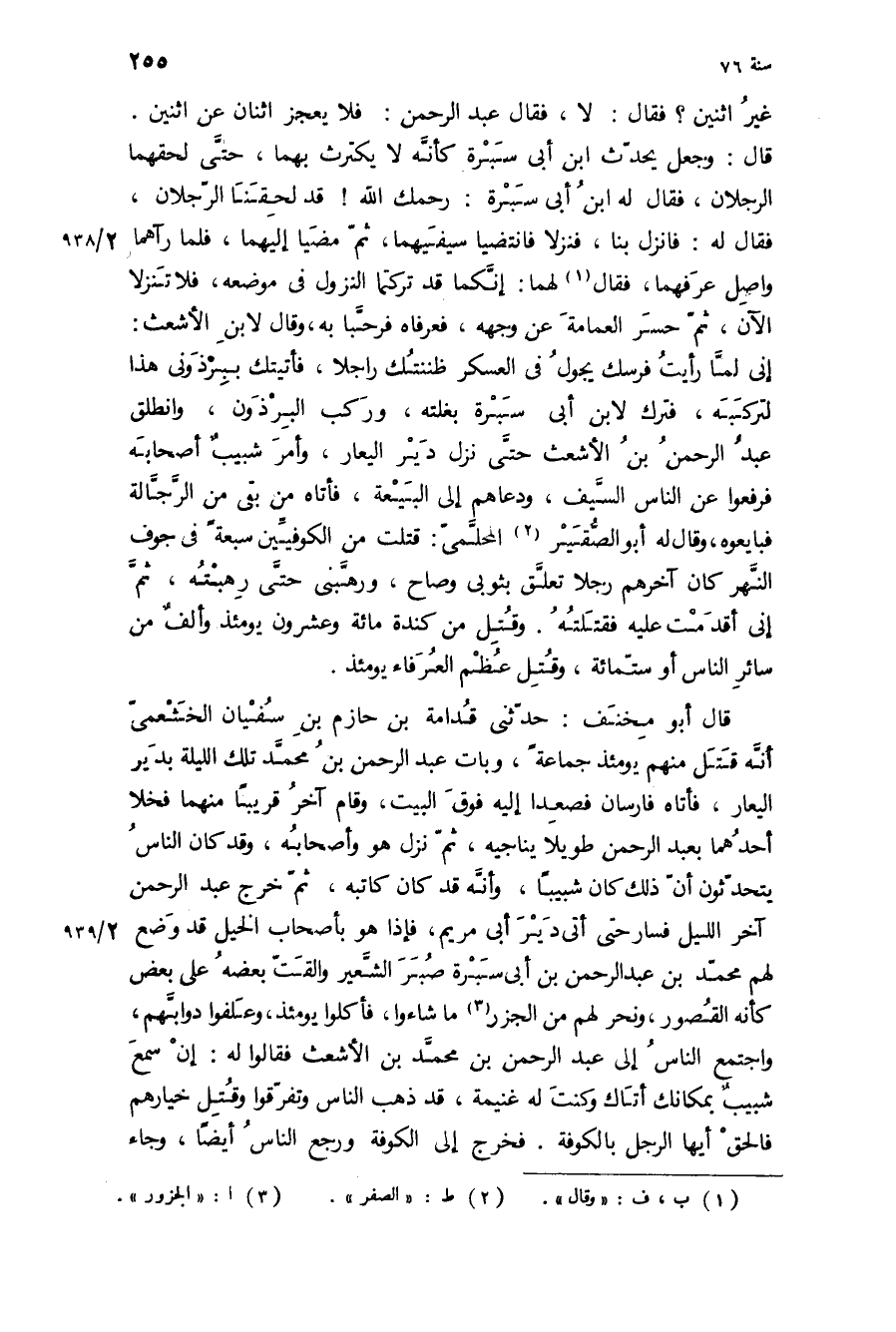 إني لما رأيت فرسك يجول في العسكر ظننتك راجلا، فأتيتك ببرذوني هذا لتركبه، فترك لابن أبي سبرة بغلته، وركب البرذون، وانطلق عبد الرحمن بن الأشعث حتى نزل دير اليعار، وأمر شبيب أصحابه فرفعوا عن الناس السيف، ودعاهم إلى البيعة، فأتاه من بقي من الرجالة فبايعوه، وقال له أبو الصقير المحلمي: قتلت من الكوفيين سبعة في جوف النهر كان آخرهم رجلا تعلق بثوبي وصاح، ورهبني حتى رهبته، ثم إني أقدمت عليه فقتلته وقتل من كندة مائة وعشرون يومئذ والف من سائر الناس او ستمائه، وقتل عظم العرفاء يومئذ قال أبو مخنف: حدثني قدامة بن حازم بن سفيان الخثعمي أنه قتل منهم يومئذ جماعة، وبات عبد الرحمن بن مُحَمَّد تلك الليلة بدير اليعار، فأتاه فارسان فصعدا إليه فوق البيت، وقام آخر قريبا منهما فخلا أحدهما بعبد الرحمن طويلا يناجيه، ثم نزل هو وأصحابه، وقد كان الناس يتحدثون أن ذلك كان شبيبا، وأنه قد كان كاتبه، ثم خرج عبد الرحمن آخر الليل فسار حتى أتى دير أبي مريم، فإذا هو بأصحاب الخيل قد وضع لهم مُحَمَّد بن عبد الرحمن بن أبي سبرة صبر الشعير والقت بعضه على بعض كأنه القصور، ونحر لهم من الجزر ما شاءوا، فأكلوا يومئذ، وعلفوا دوابهم، واجتمع الناس إِلَى عبد الرَّحْمَن بن مُحَمَّدِ بْنِ الأشعث فقالوا له: إن سمع شبيب بمكانك أتاك وكنت له غنيمة، قد ذهب الناس وتفرقوا وقتل خيارهم فالحق أيها الرجل بالكوفة فخرج إلى الكوفة ورجع الناس أيضا، وجاء