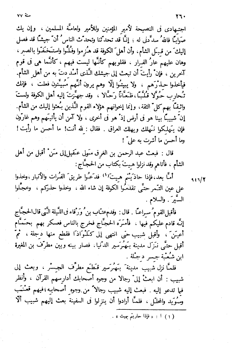 أن شبيبا بينا هو في أرض إذ هو في أخرى، ولا آمن أن يأتيهم وهم غارون فإن يهلكوا نهلك ويهلك العراق فقال: لله أنت! ما أحسن ما رأيت! وما أحسن ما أشرت به علي! قال: فبعث عبد الرحمن بن الغرق مولى عقيل الى من اقبل من أهل الشام، فأتاهم وقد نزلوا هيت بكتاب من الحجاج: