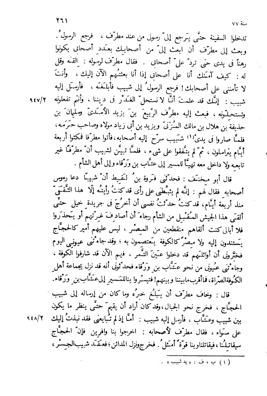 وبعث إلى مطرف أن ابعث إلي من أصحابك بعدد أصحابي يكونوا رهنا في يدي حتى ترد علي أصحابي فقال مطرف لرسوله: ألقه وقل له: كيف آمنك أنا على أصحابي إذا أنا بعثتهم الآن إليك، وأنت لا تأمنني على أصحابك! فرجع الرسول إلى شبيب فأبلغه، فأرسل إليه شبيب: إنك قد علمت أنا لا نستحل الغدر في ديننا، وأنتم تفعلونه وتستحلونه، فبعث إليه مطرف الربيع بن يزيد الأسدي وسُلَيْمَان بن حذيفة بن هلال بن مالك المزني ويزيد بن أبي زياد مولاه وصاحب حرسه، فلما صاروا في يدي شبيب سرح إليه أصحابه، فأتوا مطرفا فمكثوا أربعة أيام يتراسلون، ثم لم يتفقوا على شيء، فلما تبين لشبيب أن مطرفا غير تابعه ولا داخل معه تهيأ للمسير إلى عتاب بن ورقاء وإلى أهل الشام قال أبو مخنف: فحدثني فروة بن لقيط أن شبيبا دعا رءوس أصحابه فقال لهم: إنه لم يثبطني على رأي قد كنت رأيته إلا هذا الثقفي منذ أربعة أيام، قد كنت حدثت نفسي أن أخرج في جريدة خيل حتى ألقى هذا الجيش المقبل من الشام رجاء أن أصادف غرتهم أو يحذروا فلا أبالي كنت ألقاهم منقطعين من المصر، ليس عليهم أمير كالحجاج يستندون إليه ولا مصر كالكوفة يعتصمون به، وقد جاءتني عيوني اليوم فخبروني أن أوائلهم قد دخلوا عين التمر، فهم الآن قد شارفوا الكوفة، وجاءتني عيوني من نحو عتاب بن ورقاء فحدثوني أنه قد نزل بجماعة أهل الكوفة الصراة، فما أقرب ما بيننا وبينهم! فتيسروا بنا للمسير إلى عتاب بن ورقاء.