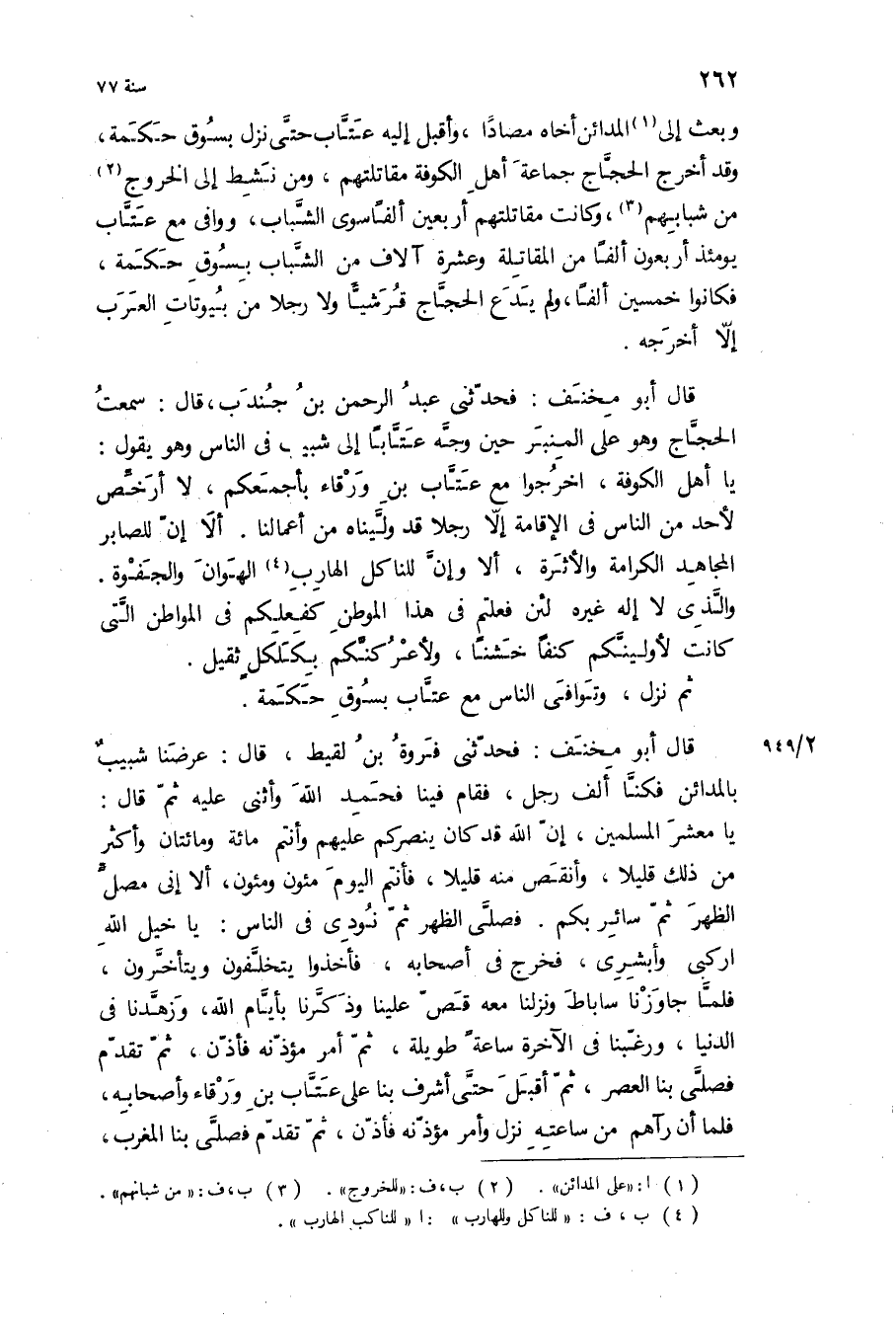 يَا معشر المسلمين، إن الله قد كان ينصركم عليهم وأنتم مائة ومائتان وأكثر من ذلك قليلا، وأنقص منه قليلا، فأنتم اليوم مئون ومئون، الا انى مصل الظهر ثم سائر بكم فصلى الظهر ثم نودي في الناس: يا خيل الله اركبي وأبشري، فخرج في أصحابه، فأخذوا يتخلفون ويتأخرون، فلما جاوزنا ساباط ونزلنا معه قص علينا وذكرنا بأيام الله، وزهدنا في الدنيا، ورغبنا في الآخرة ساعة طويلة، ثم أمر مؤذنه فأذن، ثم تقدم فصلى بنا العصر، ثم أقبل حتى أشرف بنا على عتاب بن ورقاء وأصحابه، فلما أن رآهم من ساعته نزل وأمر مؤذنه فأذن، ثم تقدم فصلى بنا المغرب،