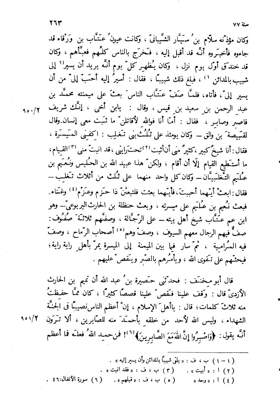 وكان مؤذنه سلام بن سيار الشيباني، وكانت عيون عتاب بن ورقاء قد جاءوه فأخبروه أنه قد أقبل إليه، فخرج بالناس كلهم فعبأهم، وكان قد خندق أول يوم نزل، وكان يظهر كل يوم أنه يريد أن يسير إلى شبيب بالمدائن، فبلغ ذلك شبيبا، فقال: أسير إليه أحب إلي من أن يسير إلي، فأتاه، فلما صف عتاب الناس بعث على ميمنته مُحَمَّد بن عبد الرحمن بن سعيد بن قيس، وقال: يا بن أخي، إنك شريف فاصبر وصابر، فقال: أما انا فو الله لأقاتلن ما ثبت معي إنسان وقال لقبيصة بن والق- وكان يومئذ على ثلث بني تغلب: أكفني الميسرة، فقال: أنا شيخ كبير، كثير منى ان اثبت تحت رايتي، قد انبت مني القيام، ما أستطيع القيام إلا أن أقام، ولكن هذا عبيد الله بن الحليس ونعيم بن عليم التغلبيان- وكان كل واحد منهما على ثلث من أثلاث تغلب- فقال: ابعث أيهما أحببت، فأيهما بعثت فلتبعثن ذا حزم وعزم وغناء.
