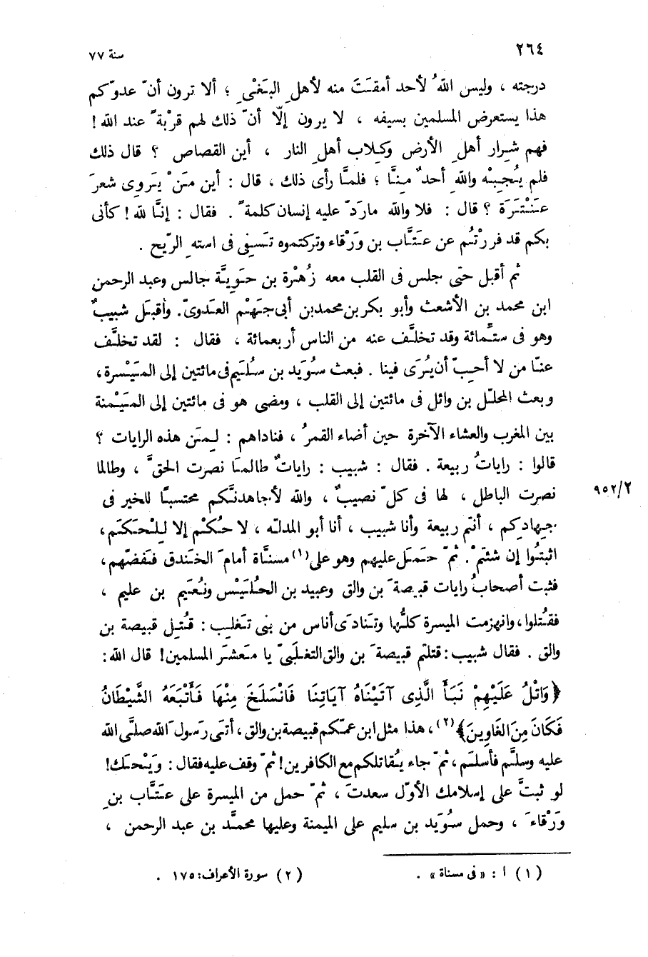 «وَاتْلُ عَلَيْهِمْ نَبَأَ الَّذِي آتَيْناهُ آياتِنا فَانْسَلَخَ مِنْها فَأَتْبَعَهُ الشَّيْطانُ فَكانَ مِنَ الْغاوِينَ» ، هذا مثل ابن عمكم قبيصة بن والق، اتى رسول الله ص فأسلم، ثم جاء يقاتلكم مع الكافرين! ثم وقف عليه فقال: ويحك! لو ثبت على إسلامك الأول سعدت، ثم حمل من الميسرة على عتاب بن ورقاء، وحمل سويد بن سليم على الميمنة وعليها مُحَمَّد بن عبد الرحمن،