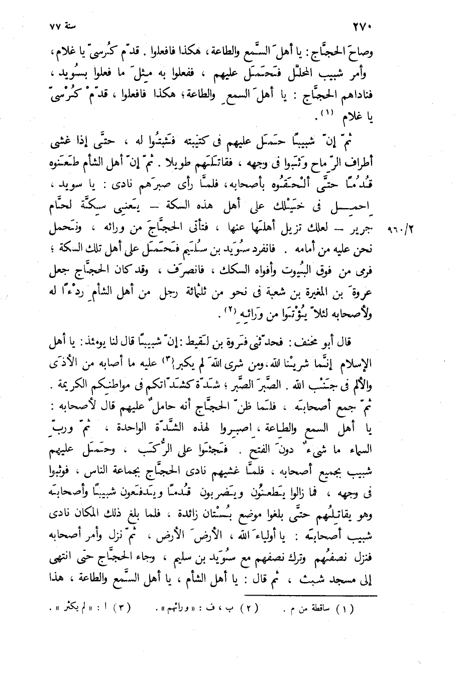 وصاح الحجاج: يا أهل السمع والطاعة، هكذا فافعلوا قدم كرسي يا غلام، وأمر شبيب المحلل فحمل عليهم، ففعلوا به مثل ما فعلوا بسويد، فناداهم الحجاج: يا أهل السمع والطاعة، هكذا فافعلوا، قدم كرسي يا غلام ثم إن شبيبا حمل عليهم في كتيبته فثبتوا له، حتى إذا غشي أطراف الرماح وثبوا في وجهه، فقاتلهم طويلا ثم إن أهل الشام طعنوه قدما حتى ألحقوه بأصحابه، فلما رأى صبرهم نادى: يا سويد، احمل في خيلك على أهل هذه السكة- يعني سكة لحام جرير- لعلك تزيل أهلها عنها، فتأتي الحجاج من ورائه، ونحمل نحن عليه من أمامه فانفرد سويد بن سليم فحمل على أهل تلك السكة، فرمي من فوق البيوت وأفواه السكك، فانصرف، وقد كان الحجاج جعل عروة بن المغيرة بن شعبة في نحو من ثلاثمائة رجل من أهل الشام ردءا له ولأصحابه لئلا يؤتوا من ورائه قال أبو مخنف: فحدثني فروة بن لقيط: أن شبيبا قال لنا يومئذ: يا أهل الإسلام إنما شرينا لله، ومن شرى لله لم يكبر عليه ما أصابه من الأذى والألم في جنب الله الصبر الصبر، شدة كشداتكم في مواطنكم الكريمة.