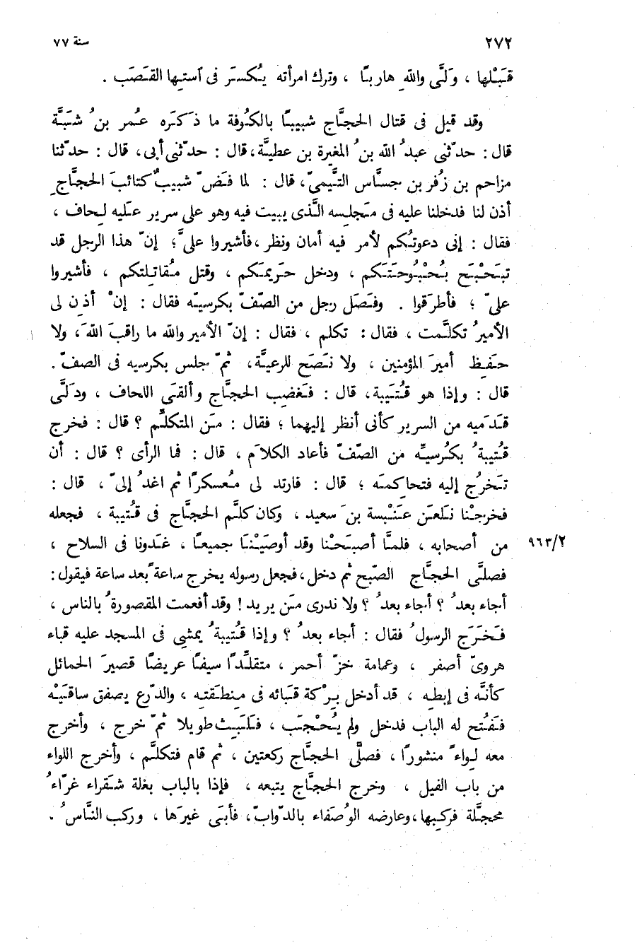 أجاء بعد؟ أجاء بعد؟ ولا ندري من يريد! وقد أفعمت المقصورة بالناس، فخرج الرسول فقال: أجاء بعد؟ وإذا قتيبة يمشي في المسجد عليه قباء هروي أصفر، وعمامة خز أحمر، متقلدا سيفا عريضا قصير الحمائل كأنه في إبطه، قد أدخل بركة قبائه في منطقته، والدرع يصفق ساقيه ففتح له الباب فدخل ولم يحجب، فلبث طويلا ثم خرج، وأخرج معه لواء منشورا، فصلى الحجاج ركعتين، ثم قام فتكلم، وأخرج اللواء من باب الفيل، وخرج الحجاج يتبعه، فإذا بالباب بغلة شقراء غراء محجلة فركبها، وعارضه الوصفاء بالدواب، فأبى غيرها، وركب الناس،