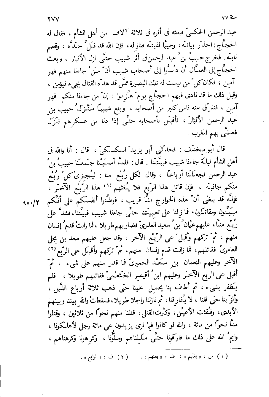 قال أبو مخنف: فحدثني أبو يزيد السكسكي، قال: أنا والله في أهل الشام ليلة جاءنا شبيب فبيتنا قال: فلما أمسينا جمعنا حبيب بن عبد الرحمن فجعلنا أرباعا، وقال لكل ربع منا: ليجزى كل ربع منكم جانبه، فإن قاتل هذا الربع فلا يغثهم هذا الربع الآخر، فإنه قد بلغني أن هذه الخوارج منا قريب، فوطنوا أنفسكم على أنكم مبيتون ومقاتلون، فما زلنا على تعبيتنا حتى جاءنا شبيب فبيتنا، فشد على ربع منا، عليهم عثمان بن سعيد العذري فضاربهم طويلا، فما زالت قدم إنسان منهم، ثم تركهم وأقبل على الربع الآخر، وقد جعل عليهم سعد بن بجل العامري فقاتلهم، فما زالت قدم إنسان منهم، ثم تركهم وأقبل على الربع الآخر وعليهم النعمان بن سعد الحميري فما قدر منهم على شيء، ثم أقبل على الربع الآخر وعليهم ابن أقيصر الخثعمي فقاتلهم طويلا، فلم يظفر بشيء، ثم أطاف بنا يحمل علينا حتى ذهب ثلاثة أرباع الليل، وألز بنا حتى قلنا، لا يفارقنا، ثم نازلنا راجلا طويلا، فسقطت والله بيننا وبينهم الأيدي، وفقئت الأعين، وكثرت القتلى، قتلنا منهم نحوا من ثلاثين، وقتلوا منا نحوا من مائة، والله لو كانوا فيما نرى يزيدون على مائة رجل لأهلكونا، وايم الله على ذلك ما فارقونا حتى مللناهم وملونا، وكرهونا وكرهناهم،