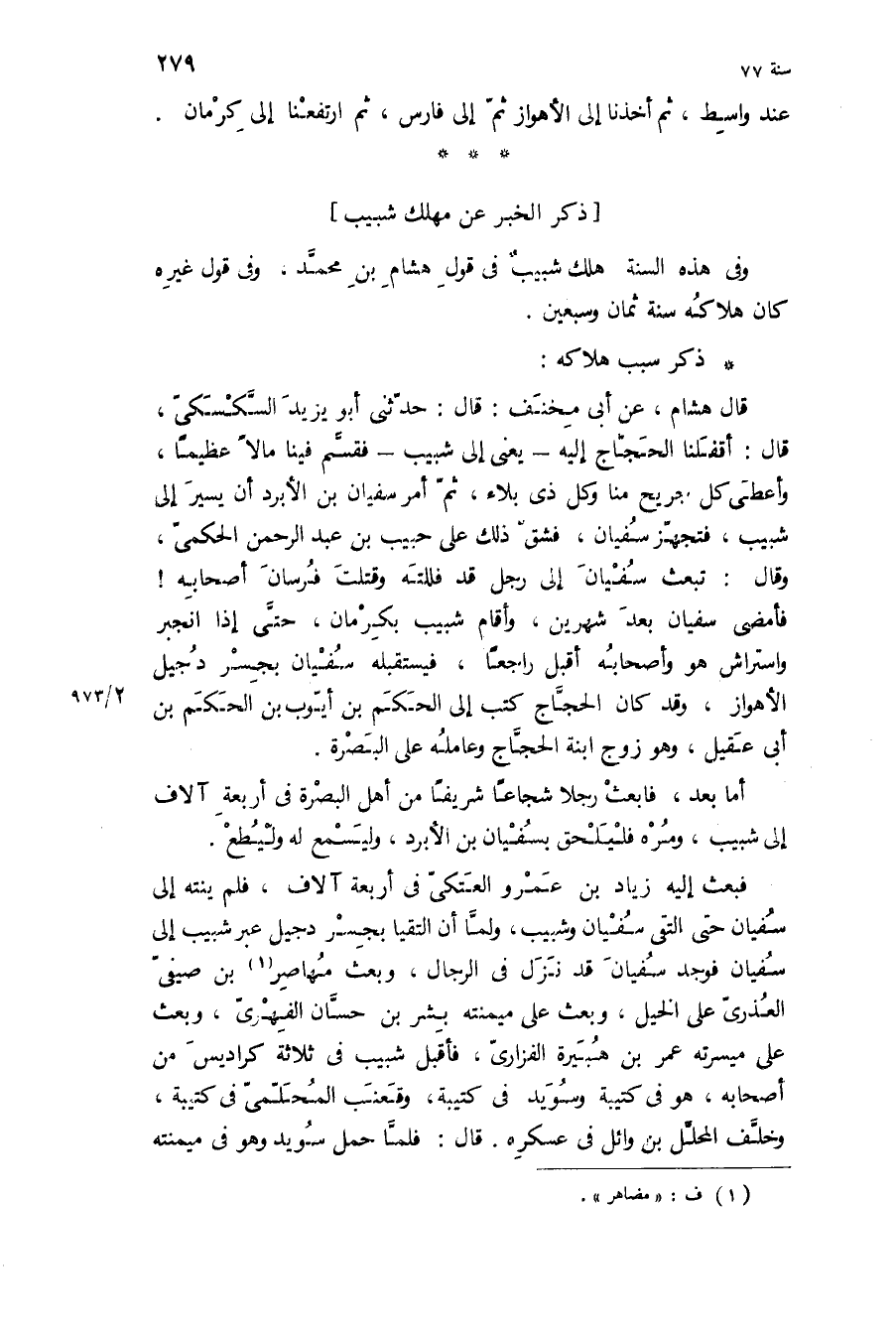 وفي هذه السنة هلك شبيب في قول هشام بن مُحَمَّد، وفي قول غيره كان هلاكه سنة ثمان وسبعين.