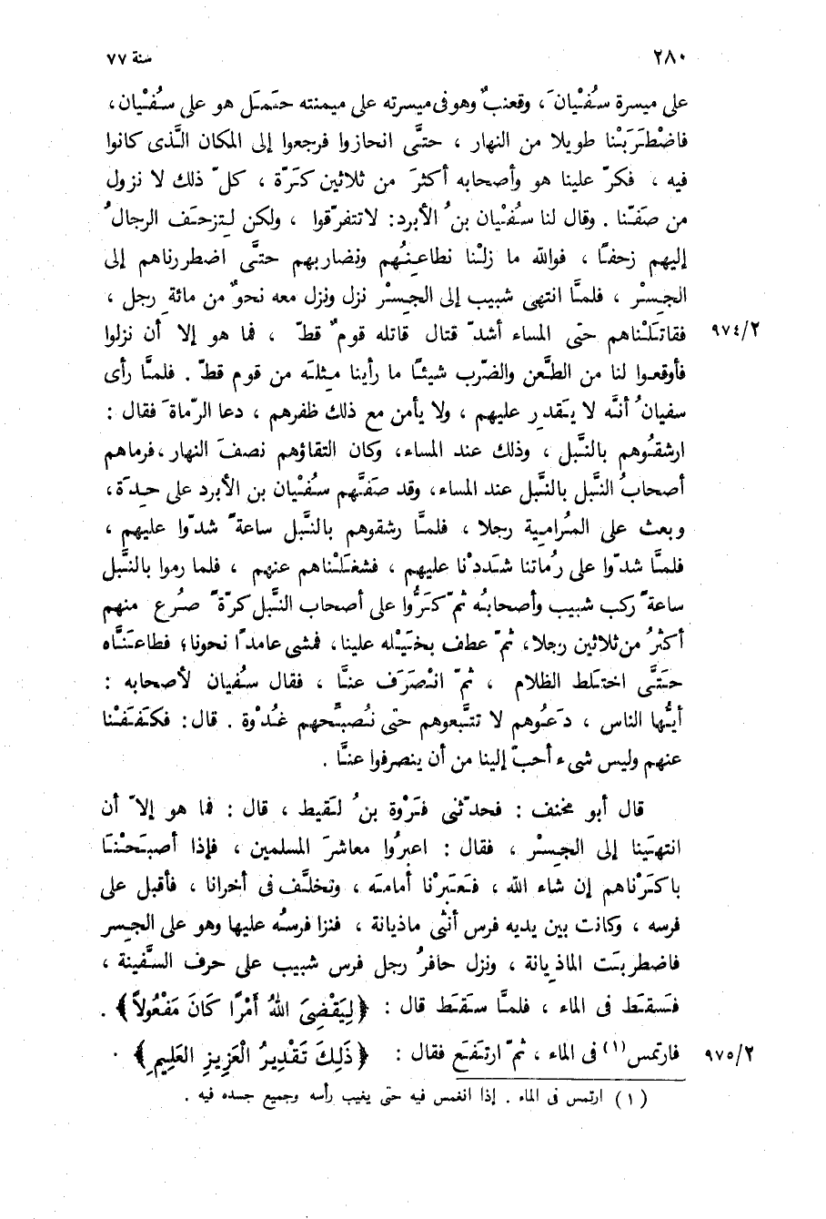 قال أبو مخنف: فحدثني فروة بن لقيط، قال: فما هو إلا أن انتهينا إلى الجسر، فقال: اعبروا معاشر المسلمين، فإذا أصبحنا باكرناهم إن شاء الله، فعبرنا أمامه، وتخلف في أخرانا، فأقبل على فرسه، وكانت بين يديه فرس أنثى ماذيانة، فنزا فرسه عليها وهو على الجسر فاضطربت الماذيانة، ونزل حافر رجل فرس شبيب على حرف السفينة، فسقط في الماء، فلما سقط قال: «لِيَقْضِيَ اللَّهُ أَمْراً كانَ مَفْعُولًا*» فارتمس في الماء، ثم ارتفع فقال: «ذلِكَ تَقْدِيرُ الْعَزِيزِ الْعَلِيمِ*»