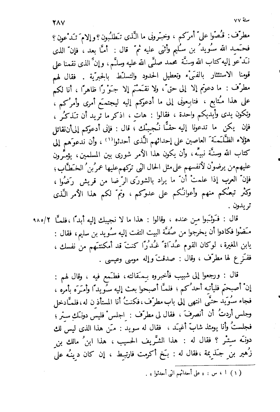 فحمد الله سويد بن سليم وأثنى عليه ثم قال: أما بعد، فإن الذي ندعو اليه كتاب الله وسنه محمد ص، وإن الذي نقمنا على قومنا الاستئثار بالفيء وتعطيل الحدود والتسلط بالجبرية فقال لهم مطرف: ما دعوتم إلا إلى حق، ولا نقمتم إلا جورا ظاهرا، أنا لكم على هذا متابع، فتابعوني إلى ما أدعوكم إليه ليجتمع أمري وأمركم، وتكون يدي وأيديكم واحدة، فقالوا: هات، اذكر ما تريد أن تذكر، فإن يكن ما تدعونا إليه حقا نجبك، قال: فإني أدعوكم إلى أن نقاتل هؤلاء الظلمة العاصين على إحداثهم الذي أحدثوا، وأن ندعوهم إلى كتاب الله وسنة نبيه، وأن يكون هذا الأمر شورى بين المسلمين، يؤمرون عليهم من يرضون لأنفسهم على مثل الحال التي تركهم عليها عمر بن الخطاب، فإن العرب إذا علمت ان ما يراد بالشورى الرضا من قريش رضوا، وكثر تبعكم منهم وأعوانكم على عدوكم، وتم لكم هذا الأمر الذي تريدون.