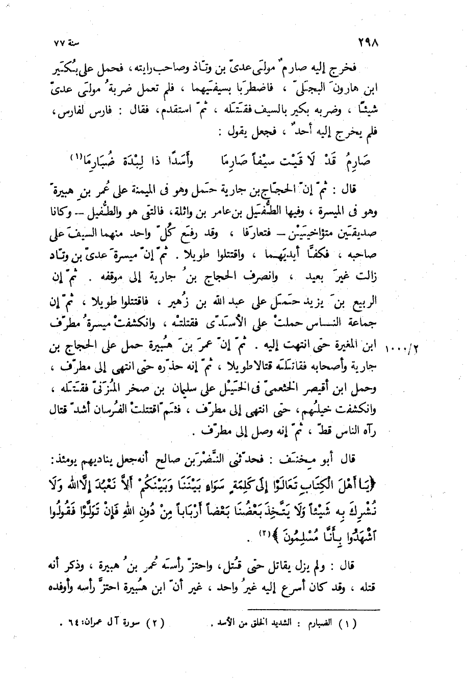 فخرج إليه صارم مولى عدي بن وتاد وصاحب رايته، فحمل على بكير ابن هارون البجلي، فاضطربا بسيفيهما، فلم تعمل ضربة مولى عدي شيئا، وضربه بكير بالسيف فقتله، ثم استقدم، فقال: فارس لفارس، فلم يخرج إليه أحد، فجعل يقول: