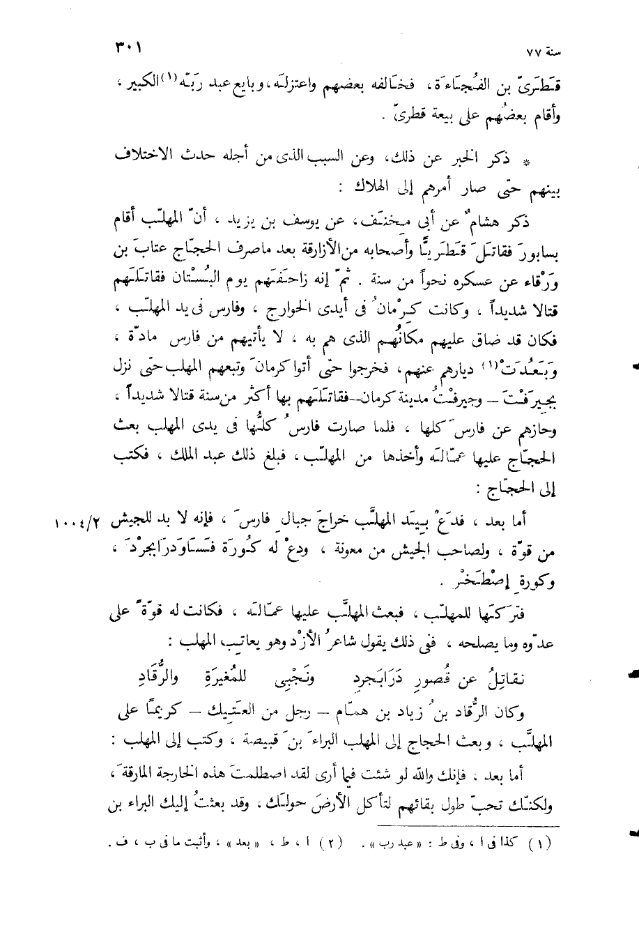 ذكر هشام عَنْ أَبِي مِخْنَفٍ، عَنْ يُوسُفَ بْنِ يَزِيدَ، أن المهلب أقام بسابور فقاتل قطريا وأصحابه من الأزارقة بعد ما صرف الحجاج عتاب بن ورقاء عن عسكره نحوا من سنة ثم إنه زاحفهم يوم البستان فقاتلهم قتالا شديدا، وكانت كرمان في أيدي الخوارج، وفارس في يد المهلب، فكان قد ضاق عليهم مكانهم الذي هم به، لا يأتيهم من فارس مادة، وبعدت ديارهم عنهم، فخرجوا حتى أتوا كرمان وتبعهم المهلب حتى نزل بجيرفت- وجيرفت مدينة كرمان- فقاتلهم بها أكثر من سنة قتالا شديدا، وحازهم عن فارس كلها، فلما صارت فارس كلها في يدي المهلب بعث الحجاج عليها عماله وأخذها من المهلب، فبلغ ذلك عبد الملك، فكتب إلى الحجاج: