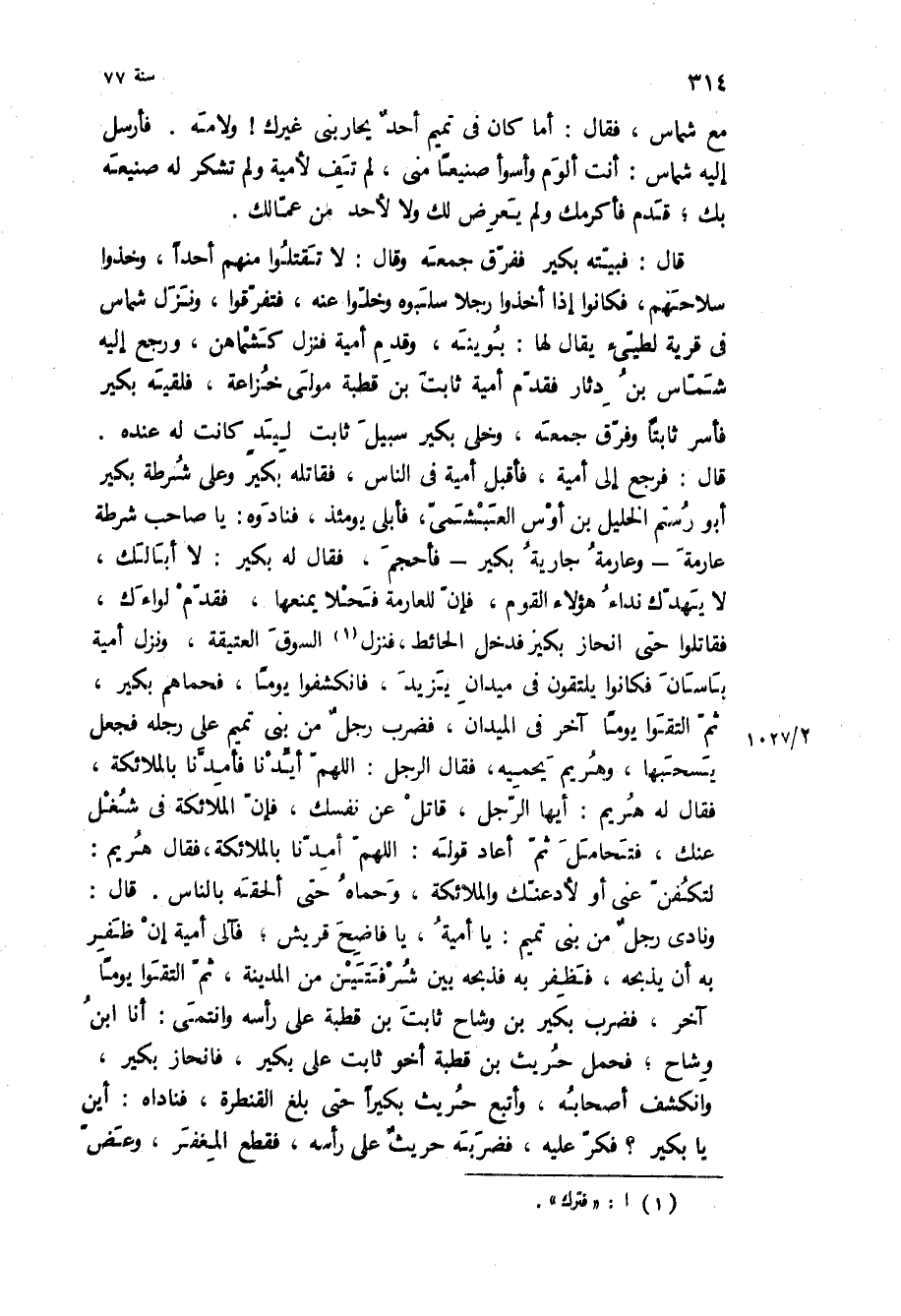 قال: فبيته بكير ففرق جمعه وقال: لا تقتلوا منهم أحدا، وخذوا سلاحهم، فكانوا إذا أخذوا رجلا سلبوه وخلوا عنه، فتفرقوا، ونزل شماس في قرية لطيئ يقال لها: بوينة، وقدم أمية فنزل كشماهن، ورجع إليه شماس بن دثار فقدم أمية ثابت بن قطبة مولى خزاعة، فلقيه بكير فأسر ثابتا وفرق جمعه، وخلى بكير سبيل ثابت ليد كانت له عنده قال: فرجع إلى أمية، فأقبل أمية في الناس، فقاتله بكير وعلى شرطة بكير أبو رستم الخليل بن أوس العبشمي، فأبلى يومئذ، فنادوه: يا صاحب شرطة عارمة- وعارمة جارية بكير- فأحجم، فقال له بكير: لا أبا لك، لا يهدك نداء هؤلاء القوم، فإن للعارمة فحلا يمنعها، فقدم لواءك، فقاتلوا حتى انحاز بكير فدخل الحائط، فنزل السوق العتيقة، ونزل أمية باسان فكانوا يلتقون في ميدان يزيد، فانكشفوا يوما، فحماهم بكير، ثم التقوا يوما آخر في الميدان، فضرب رجل من بني تميم على رجله فجعل يسحبها، وهريم يحميه، فقال الرجل: اللهم أيدنا فأمدنا بالملائكة، فقال له هريم: أيها الرجل، قاتل عن نفسك، فإن الملائكة في شغل عنك، فتحامل ثم أعاد قوله: اللهم أمدنا بالملائكة، فقال هريم: