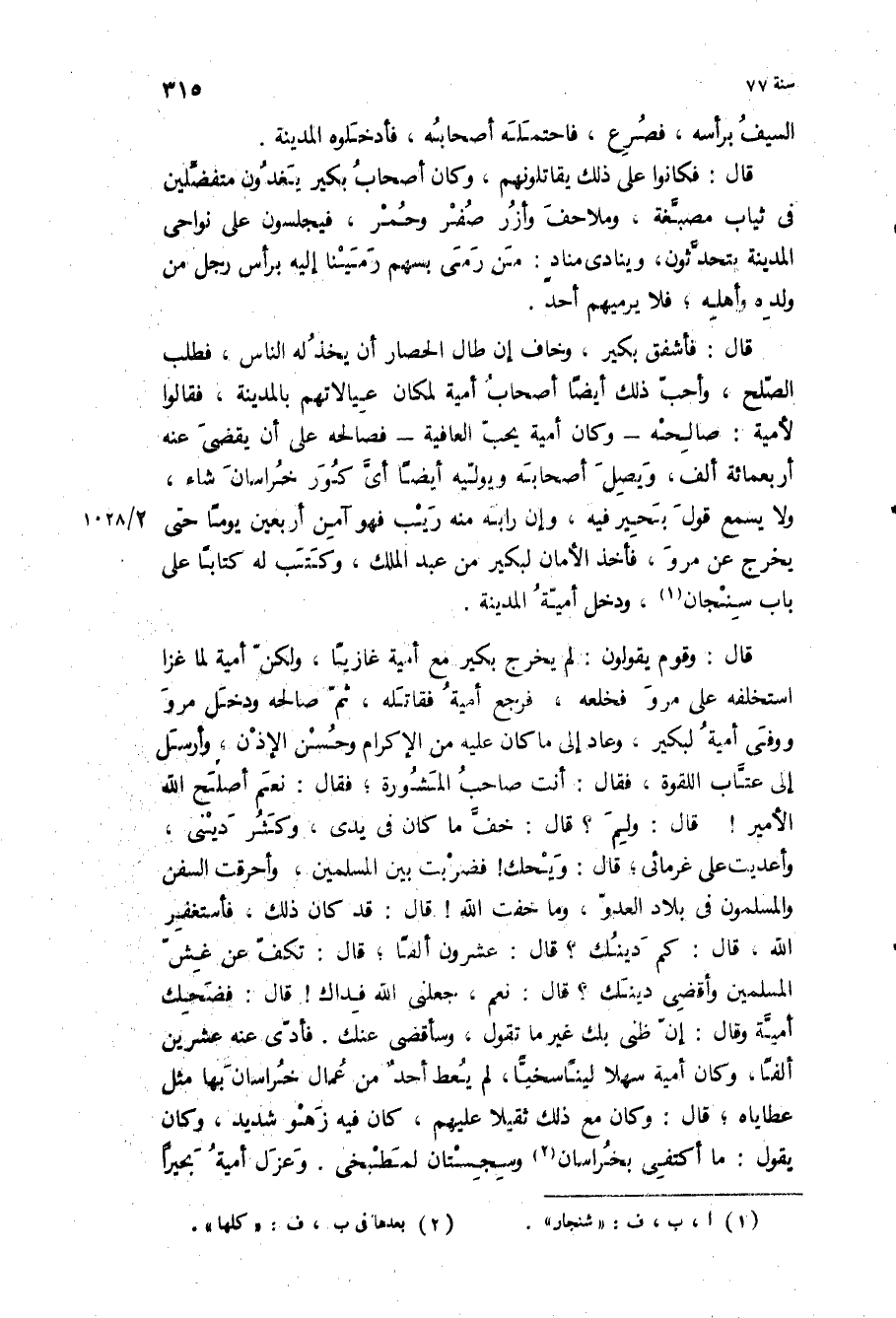 قال: فأشفق بكير، وخاف إن طال الحصار أن يخذله الناس، فطلب الصلح، وأحب ذلك أيضا أصحاب أمية لمكان عيالاتهم بالمدينة، فقالوا لأمية: صالحه- وكان أمية يحب العافيه- فصالحه على ان يقضى عنه أربعمائة الف، ويصل اصحابه ويوليه أيضا أي كور خراسان شاء، ولا يسمع قول بحير فيه، وإن رابه منه ريب فهو آمن أربعين يوما حتى يخرج عن مرو، فأخذ الأمان لبكير من عبد الملك، وكتب له كتابا على باب سنجان، ودخل أمية المدينة قال: وقوم يقولون: لم يخرج بكير مع أمية غازيا، ولكن أمية لما غزا استخلفه على مرو فخلعه، فرجع أمية فقاتله، ثم صالحه ودخل مرو ووفى أمية لبكير وعاد إلى ما كان عليه من الإكرام وحسن الإذن، وأرسل إلى عتاب اللقوة، فقال: أنت صاحب المشورة، فقال: نعم أصلح الله الأمير! قال: ولم؟ قال: خف ما كان في يدي، وكثر ديني، وأعديت على غرمائي، قال: ويحك! فضربت بين المسلمين، وأحرقت السفن والمسلمون في بلاد العدو، وما خفت الله! قال: قد كان ذلك، فأستغفر الله، قال: كم دينك؟ قال: عشرون ألفا، قال: تكف عن غش المسلمين وأقضي دينك؟ قال: نعم، جعلني الله فداك! قال: فضحك أمية وقال: إن ظني بك غير ما تقول، وسأقضي عنك فأدى عنه عشرين ألفا، وكان أمية سهلا لينا سخيا، لم يعط أحد من عمال خراسان بها مثل عطاياه، قال: وكان مع ذلك ثقيلا عليهم، كان فيه زهو شديد، وكان يقول: ما أكتفي بخراسان وسجستان لمطبخي وعزل أمية بحيرا