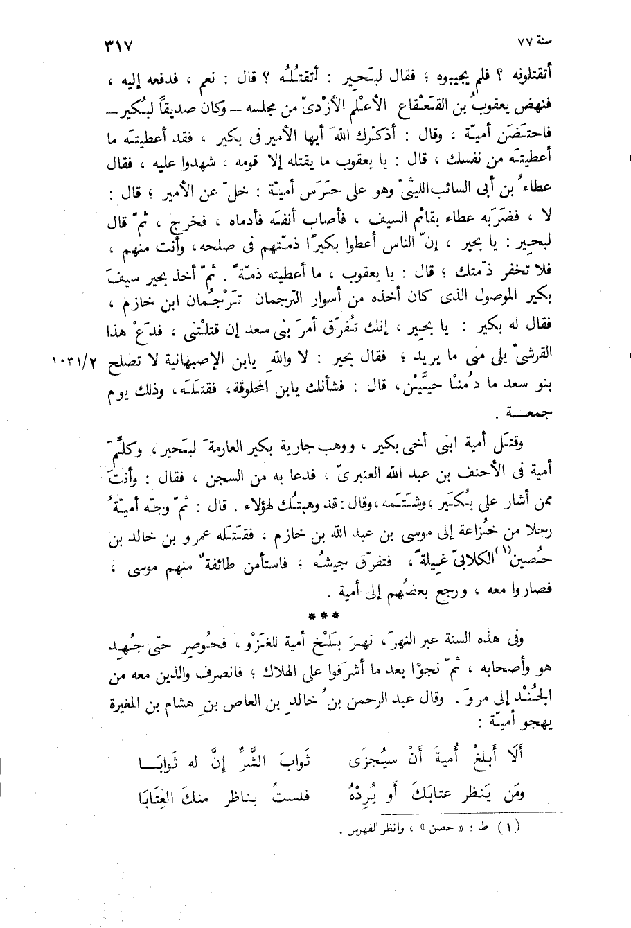 وقتل أمية ابني أخي بكير، ووهب جارية بكير العارمة لبحير، وكلم أمية في الأحنف بن عبد الله العنبري، فدعا به من السجن، فقال: وأنت ممن أشار على بكير، وشتمه، وقال: قد وهبتك لهؤلاء قال: ثم وجه أمية رجلا من خزاعة إلى موسى بن عبد الله بن خازم، فقتله عمرو بن خالد بن حصين الكلابي غيلة، فتفرق جيشه، فاستأمن طائفة منهم موسى، فصاروا معه، ورجع بعضهم الى اميه.