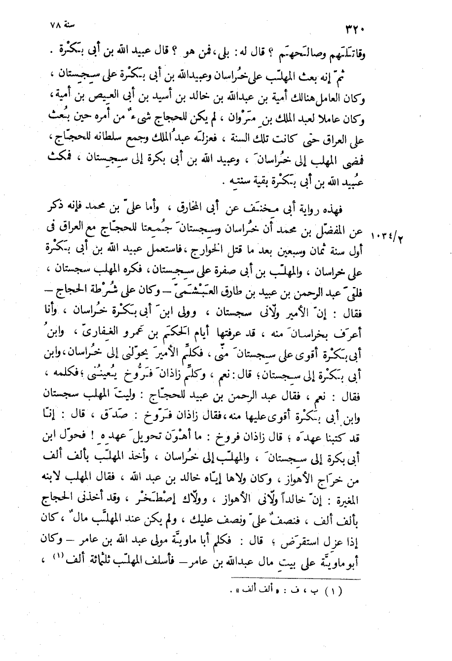 فهذه رواية أبي مخنف عن أبي المخارق، وأما علي بن مُحَمَّد فإنه ذكر عن المفضل بن مُحَمَّد أن خراسان وسجستان جمعتا للحجاج مع العراق في أول سنة ثمان وسبعين بعد ما قتل الخوارج، فاستعمل عبيد الله بن أبي بكرة على خراسان، والمهلب بن أبي صفرة على سجستان، فكره المهلب سجستان، فلقي عبد الرحمن بن عبيد بن طارق العبشمي- وكان على شرطة الحجاج- فقال: إن الأمير ولاني سجستان، وولى ابن أبي بكرة خراسان، وأنا أعرف بخراسان منه، قد عرفتها أيام الحكم بن عمرو الغفاري، وابن أبي بكرة أقوى على سجستان مني، فكلم الأمير يحولني إلى خراسان، وابن أبي بكرة إلى سجستان، قال: نعم، وكلم زاذان فروخ يعينني، فكلمه، فقال: نعم، فقال عبد الرحمن بن عبيد للحجاج: وليت المهلب سجستان وابن أبي بكرة أقوى عليها منه، فقال زاذان فروخ: صدق، قال: إنا قد كتبنا عهده، قال زاذان فروخ: ما أهون تحويل عهده! فحول ابن أبي بكرة إلى سجستان، والمهلب إلى خراسان، وأخذ المهلب بألف ألف من خراج الأهواز، وكان ولاها إياه خالد بن عبد الله، فقال المهلب لابنه المغيرة: إن خالدا ولاني الأهواز، وولاك إصطخر، وقد أخذني الحجاج بألف ألف، فنصف علي ونصف عليك، ولم يكن عند المهلب مال، كان إذا عزل استقرض، قال: فكلم أبا ماوية مولى عبد الله بن عامر- وكان أبو ماوية على بيت مال عبد الله بن عامر- فأسلف المهلب ثلاثمائة الف،