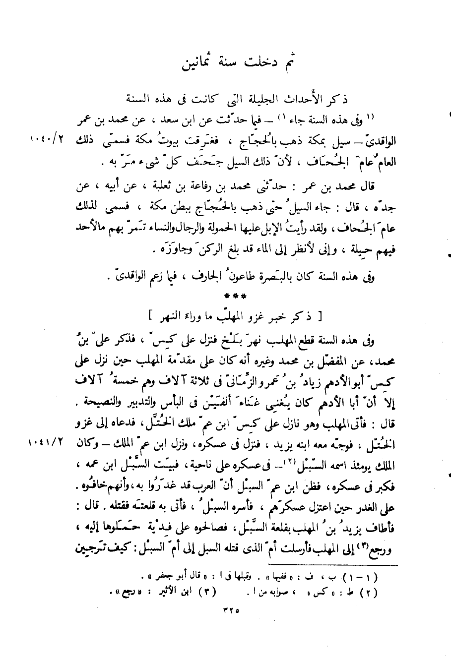 (ذكر الأحداث الجليلة التي كانت في هذه السنة) وفي هذه السنة جاء- فيما حدثت عَنِ ابْنِ سَعْدٍ، عَنْ مُحَمَّدِ بْنِ عُمَرَ الواقدي- سيل بمكة ذهب بالحجاج، فغرقت بيوت مكة فسمي ذلك العام عام الجحاف، لأن ذلك السيل جحف كل شيء مر به.