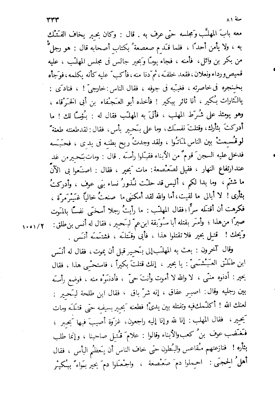 معه باب المهلب ومجلسه حتى عرف به قال: وكان بحير يخاف الفتك به، ولا يأمن أحدا، فلما قدم صعصعة بكتاب أصحابه قال: هو رجل من بكر بن وائل، فأمنه، فجاء يوما وبحير جالس في مجلس المهلب، عليه قميص ورداء ونعلان، فقعد خلفه، ثم دنا منه، فأكب عليه كأنه بكلمة، فوجأه بخنجره في خاصرته، فغيبه في جوفه، فقال الناس: خارجي!، فنادى:
