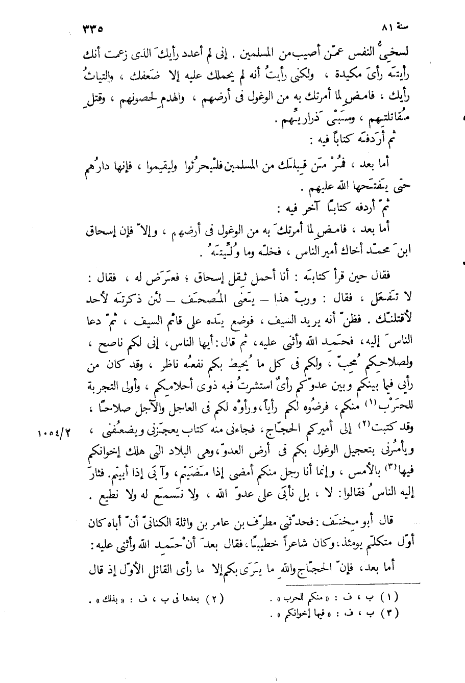 أما بعد، فامض لما أمرتك به من الوغول في أرضهم، وإلا فإن إسحاق ابن مُحَمَّد أخاك أمير الناس، فخله وما وليته.