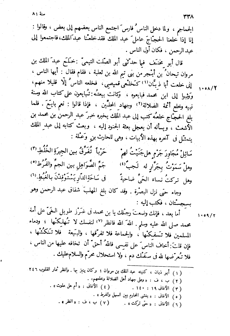 قال أبو مخنف فيما حدثني أبو الصلت التيمي: خلع عبد الملك بن مروان تيحان بن أبجر من بني تيم الله بن ثعلبة، فقام فقال: أيها الناس، إني خلعت أبا ذبان كخلعي قميصي، فخلعه الناس إلا قليلا منهم، ووثبوا إلى ابن مُحَمَّد فبايعوه، وكانت بيعته: تبايعون على كتاب الله وسنة نبيه وخلع أئمة الضلالة وجهاد المحلين، فإذا قالوا: نعم بايع فلما بلغ الحجاج خلعه كتب إلى عبد الملك يخبره خبر عبد الرحمن بن مُحَمَّد بن الأشعث، ويسأله أن يعجل بعثة الجنود إليه، وبعث كتابه إلى عبد الملك يتمثل في آخره بهذه الأبيات، وهي للحارث بن وعلة: