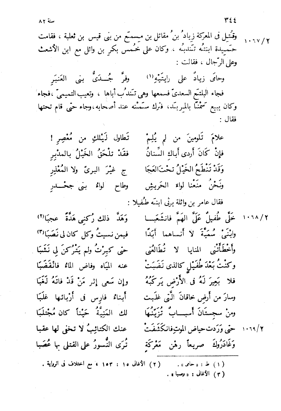 1068 خلى طفيل علي الهم فانشعبا وهد ذلك ركني هدة عجبا وابني سمية لا أنساهما أبدا فيمن نسيت وكل كان لي نصبا وأخطأتني المنايا لا تطالعني حتى كبرت ولم يتركن لي نشبا وكنت بعد طفيل كالذي نضبت عنه المياه وفاض الماء فانقضبا فلا بعير له في الأرض يركبه وإن سعى إثر من قد فاته لغبا وسار من أرض خاقان التي غلبت أبناء فارس في أربائها غلبا ومن سجستان أسباب تزينها لك المنية حينا كان مجتلبا حتى وردت حياض الموت فانكشفت عنك الكتائب لا تخفى لها عقبا وغادروك صريعا رهن معركة ترى النسور على القتلى بها عصبا