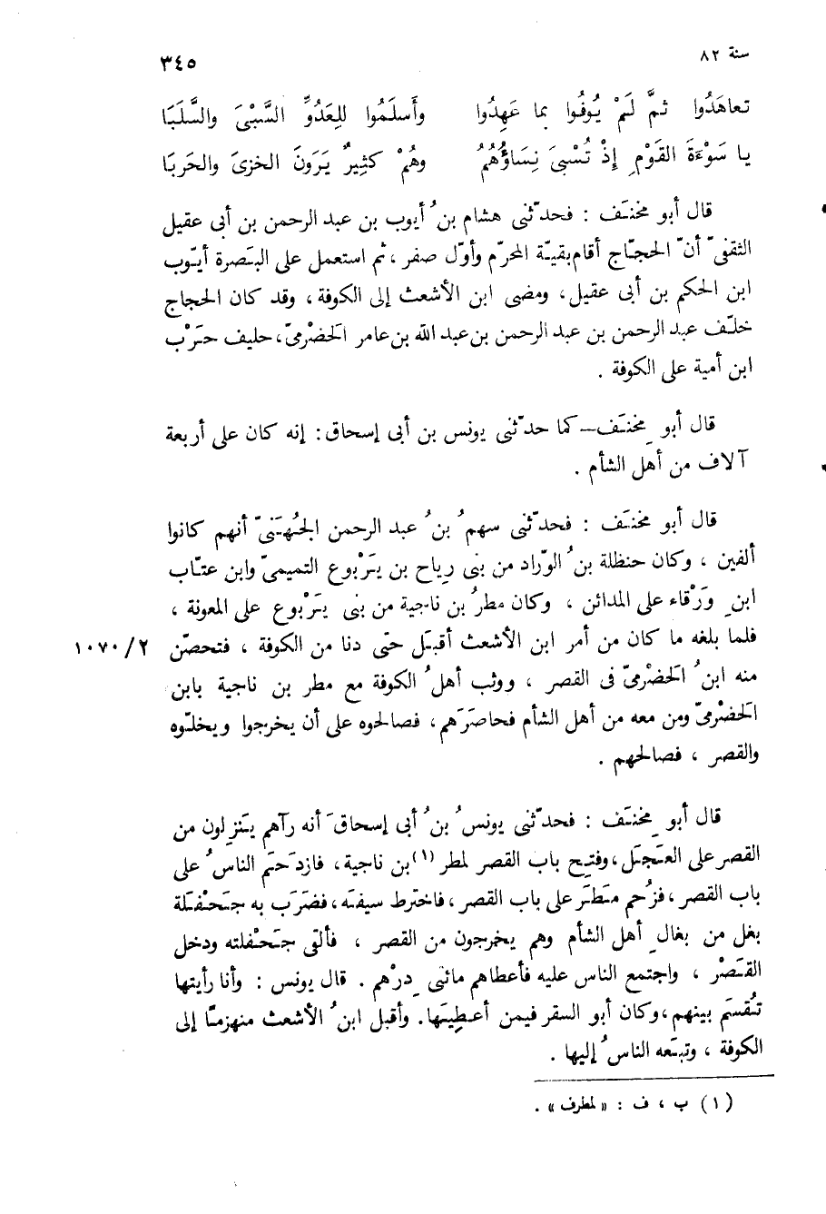 تعاهدوا ثم لم يوفوا بما عهدوا وأسلموا للعدو السبي والسلبا يا سوءة القوم إذ تسبى نساؤهمُ وهم كثير يرون الخزي والحربا قال أبو مخنف: فحدثني هشام بن أيوب بن عبد الرحمن بن أبي عقيل الثقفي أن الحجاج أقام بقية المحرم وأول صفر، ثم استعمل على البصره أيوب ابن الحكم بن أبي عقيل، ومضى ابن الأشعث إلى الكوفة، وقد كان الحجاج خلف عبد الرحمن بْنُ عَبْدِ الرَّحْمَنِ بْنِ عَبْدِ اللَّهِ بْنِ عامر الحضرمى، حليف حرب ابن أمية على الكوفة.