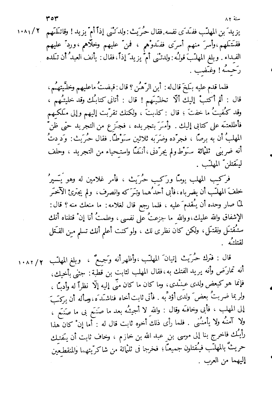 قال: فترك حريث إتيان المهلب، وأظهر أنه وجع، وبلغ المهلب أنه تمارض وأنه يريد الفتك به، فقال المهلب لثابت بن قطبة: جئني بأخيك، فإنما هو كبعض ولدي عندي، وما كان ما كان مني إليه إلا نظرا له وأدبا، ولربما ضربت بعض ولدي أؤدبه فأتى ثابت أخاه فناشده، وسأله أن يركب إلى المهلب، فأبى وخافه وقال: والله لا أجيئه بعد ما صنع بي ما صنع، ولا آمنه ولا يأمنني فلما رأى ذلك أخوه ثابت قال له: أما إن كان هذا رأيك فاخرج بنا إلى موسى بن عبد الله بن خازم، وخاف ثابت أن يفتك حريث بالمهلب فيقتلون جميعا، فخرجا في ثلاثمائة من شاكريتهما والمنقطعين إليهما من العرب