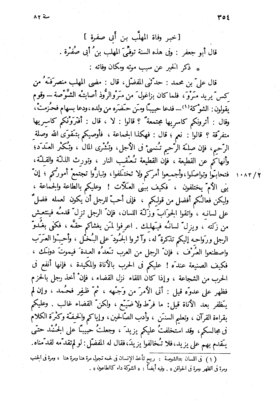 قال علي بن مُحَمَّد: حدثني المفضل، قال: مضى المهلب منصرفه من كس يريد مرو، فلما كان بزاغول من مرو الروذ أصابته الشوصة- وقوم يقولون: الشوكة- فدعا حبيبا ومن حضره من ولده، ودعا بسهام فحزمت، وقال: أترونكم كاسريها مجتمعة؟ قالوا: لا، قال: أفترونكم كاسريها متفرقة؟ قالوا: نعم، قال: فهكذا الجماعة، فأوصيكم بتقوى الله وصلة الرحم، فان صله الرحم تنسئ في الأجل، وتشرى المال، وتكثر العدد، وأنهاكم عن القطيعة، فإن القطيعة تعقب النار، وتورث الذلة والقلة، فتحابوا وتواصلوا، وأجمعوا أمركم ولا تختلفوا، وتباروا تجتمع أموركم، إن بني الأم يختلفون، فكيف ببني العلات! وعليكم بالطاعة والجماعة، وليكن فعالكم أفضل من قولكم، فإني أحب للرجل أن يكون لعمله فضل على لسانه، واتقوا الجواب وزلة اللسان، فإن الرجل تزل قدمه فينتعش من زلته، ويزل لسانه فيهلك اعرفوا لمن يغشاكم حقه، فكفى بغدو الرجل ورواحه إليكم تذكرة له، وآثروا الجود على البخل، وأحبوا العرب واصطنعوا العرف، فإن الرجل من العرب تعده العدة فيموت دونك، فكيف الصنيعة عنده! عليكم في الحرب بالأناة والمكيدة، فإنها أنفع في الحرب من الشجاعة، وإذا كان اللقاء نزل القضاء، فإن أخذ رجل بالحزم فظهر على عدوه قيل: أتى الأمر من وجهه، ثم ظفر فحمد، وإن لم يظفر بعد الأناة قيل: ما فرط ولا ضيع، ولكن القضاء غالب وعليكم بقراءة القرآن، وتعليم السنن، وأدب الصالحين، وإياكم والخفة وكثرة الكلام في مجالسكم، وقد استخلفت عليكم يزيد، وجعلت حبيبا على الجند حتى يقدم بهم على يزيد، فلا تخالفوا يزيد، فقال له المفضل: لو لم تقدمه لقدمناه