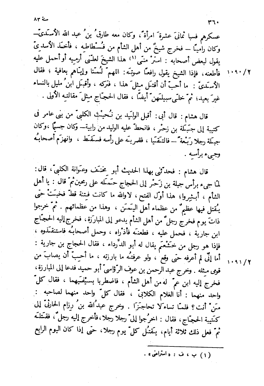 أما إني لم أعرفه حتى وقع، ولو عرفته ما بارزته، ما أحب أن يصاب من قومي مثله وخرج عبد الرحمن بن عوف الرؤاسي أبو حميد فدعا إلى المبارزة، فخرج إليه ابن عم له من أهل الشام، فاضطربا بسيفيهما، فقال كل واحد منهما: أنا الغلام الكلابي، فقال كل واحد منهما لصاحبه: