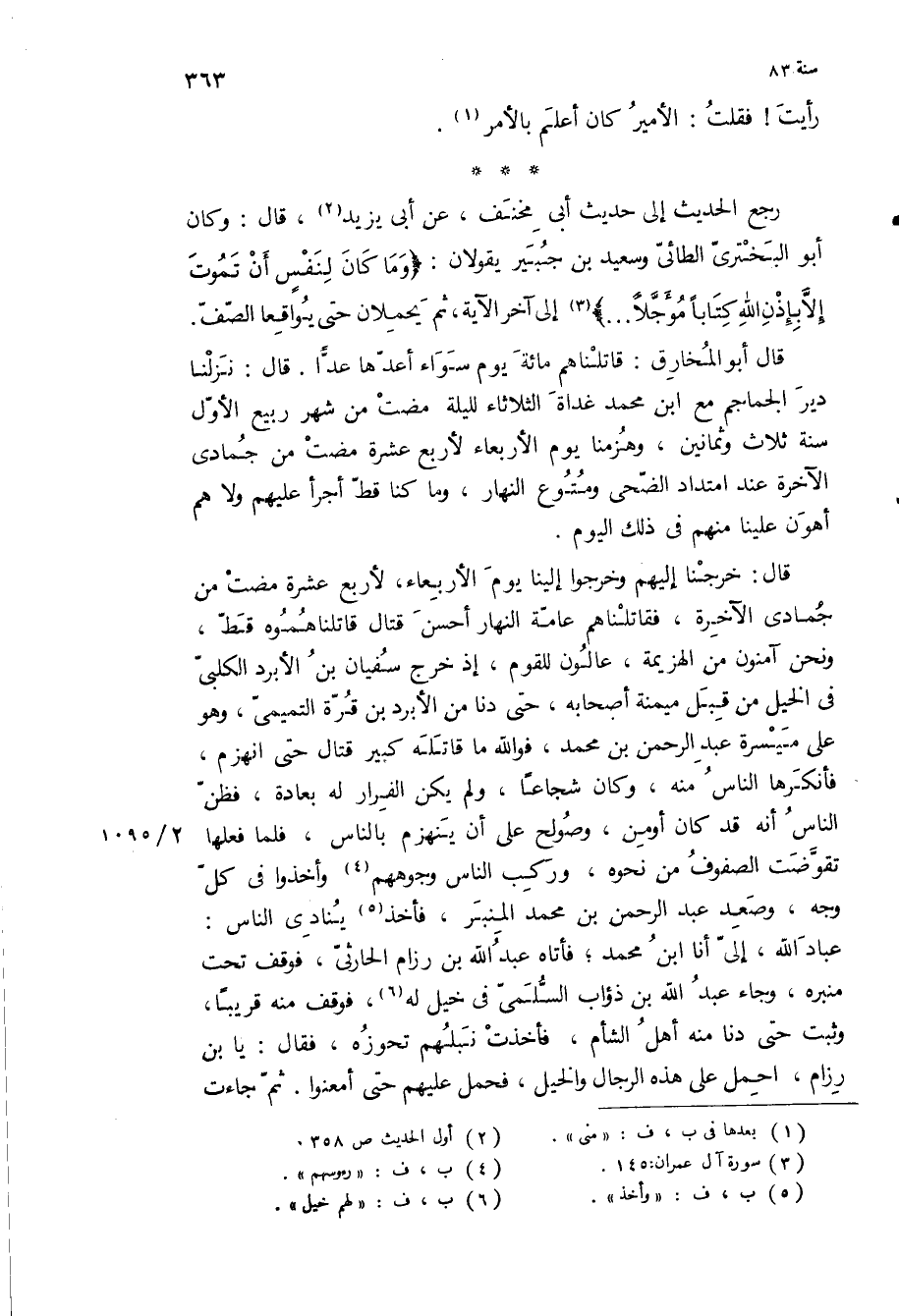 رجع الحديث إِلَى حديث أبي مخنف، عَنْ أبي يزيد، قال: وكان أبو البختري الطائي وسعيد بن جبير يقولان: «وَما كانَ لِنَفْسٍ أَنْ تَمُوتَ إِلَّا بِإِذْنِ اللَّهِ كِتاباً مُؤَجَّلًا» إلى آخر الآية، ثم يحملان حتى يواقعا الصف.