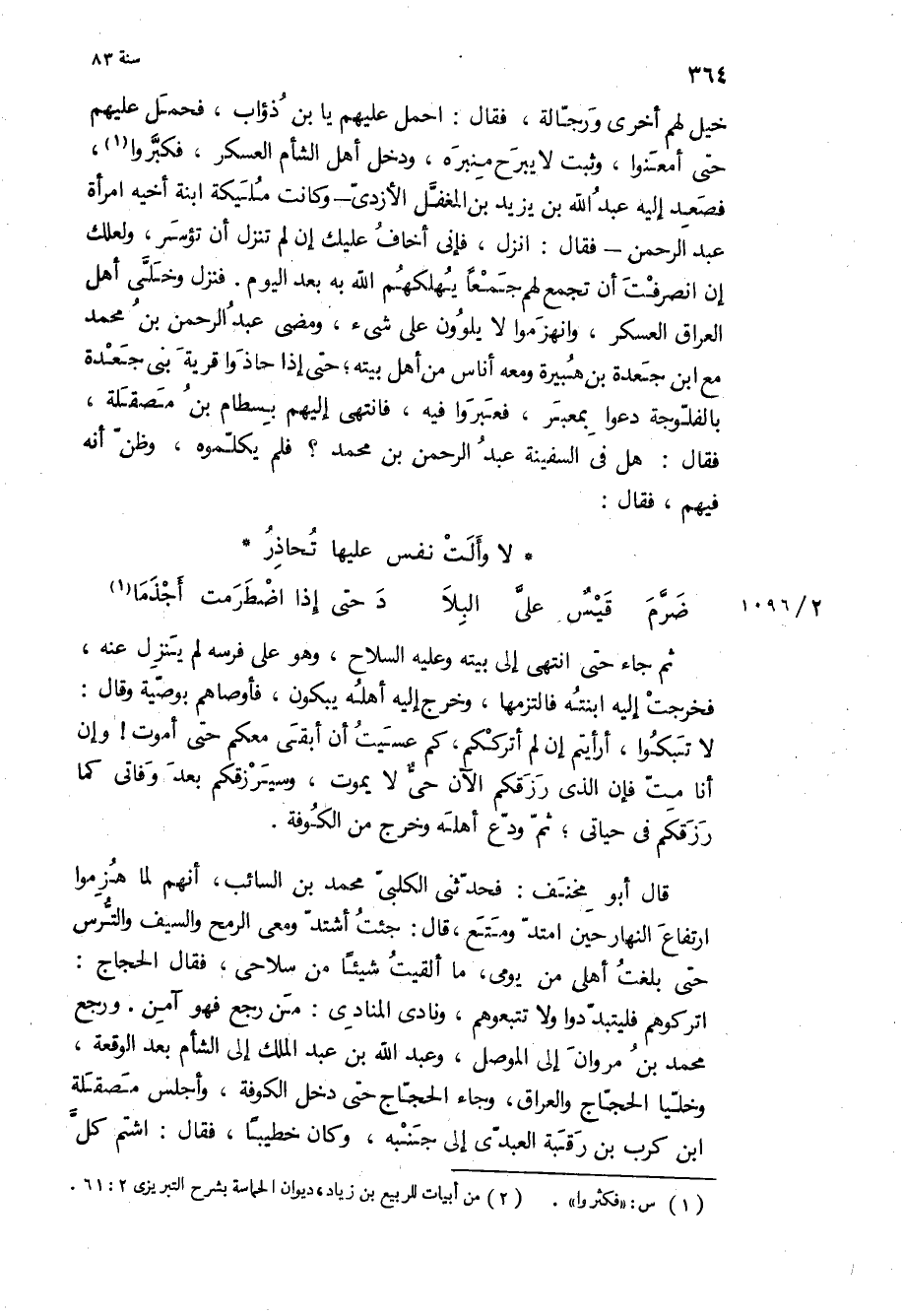 خيل لهم أخرى ورجالة، فقال: احمل عليهم يا بن ذؤاب، فحمل عليهم حتى أمعنوا، وثبت لا يبرح منبره، ودخل أهل الشام العسكر، فكبروا، فصعد إليه عبد الله بن يزيد بن المغفل الأزدي- وكانت مليكه ابنة أخيه امرأة عبد الرحمن- فقال: انزل، فإني أخاف عليك إن لم تنزل أن تؤسر، ولعلك إن انصرفت أن تجمع لهم جمعا يهلكهم الله به بعد اليوم فنزل وخلى أهل العراق العسكر، وانهزموا لا يلوون على شيء، ومضى عبد الرحمن بن مُحَمَّد مع ابن جعدة بن هبيرة ومعه أناس من أهل بيته، حتى إذا حاذوا قرية بني جعدة بالفلوجة دعوا بمعبر، فعبروا فيه، فانتهى إليهم بسطام بن مصقلة، فقال: هل في السفينة عبد الرحمن بن مُحَمَّد؟ فلم يكلموه، وظن أنه فيهم، فقال:
