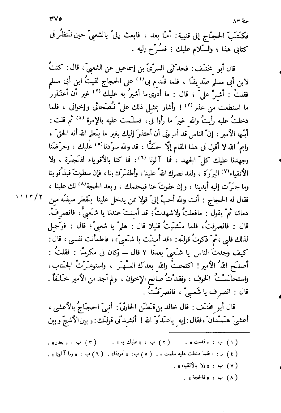 قال: انصرف يا شعبي، فانصرفت قال أبو مخنف: قال خالد بن قطن الحارثي: أتي الحجاج بالأعشى، أعشى همدان، فقال: إيه يا عدو الله! أنشدني قولك: بين الأشج وبين