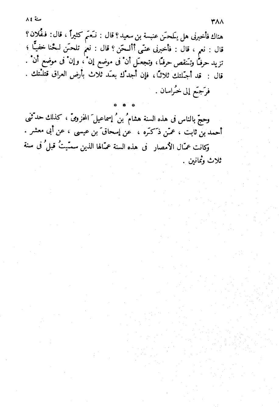 وحج بالناس في هذه السنة هشام بن إسماعيل المخزومي، كذلك حَدَّثَنِي أَحْمَدُ بْن ثَابِت، عمن ذكره، عن إسحاق بن عيسى، عن أبي معشر، وكانت عمال الأمصار في هذه السنة عمالها الذين سميت قبل في سنة ثلاث وثمانين